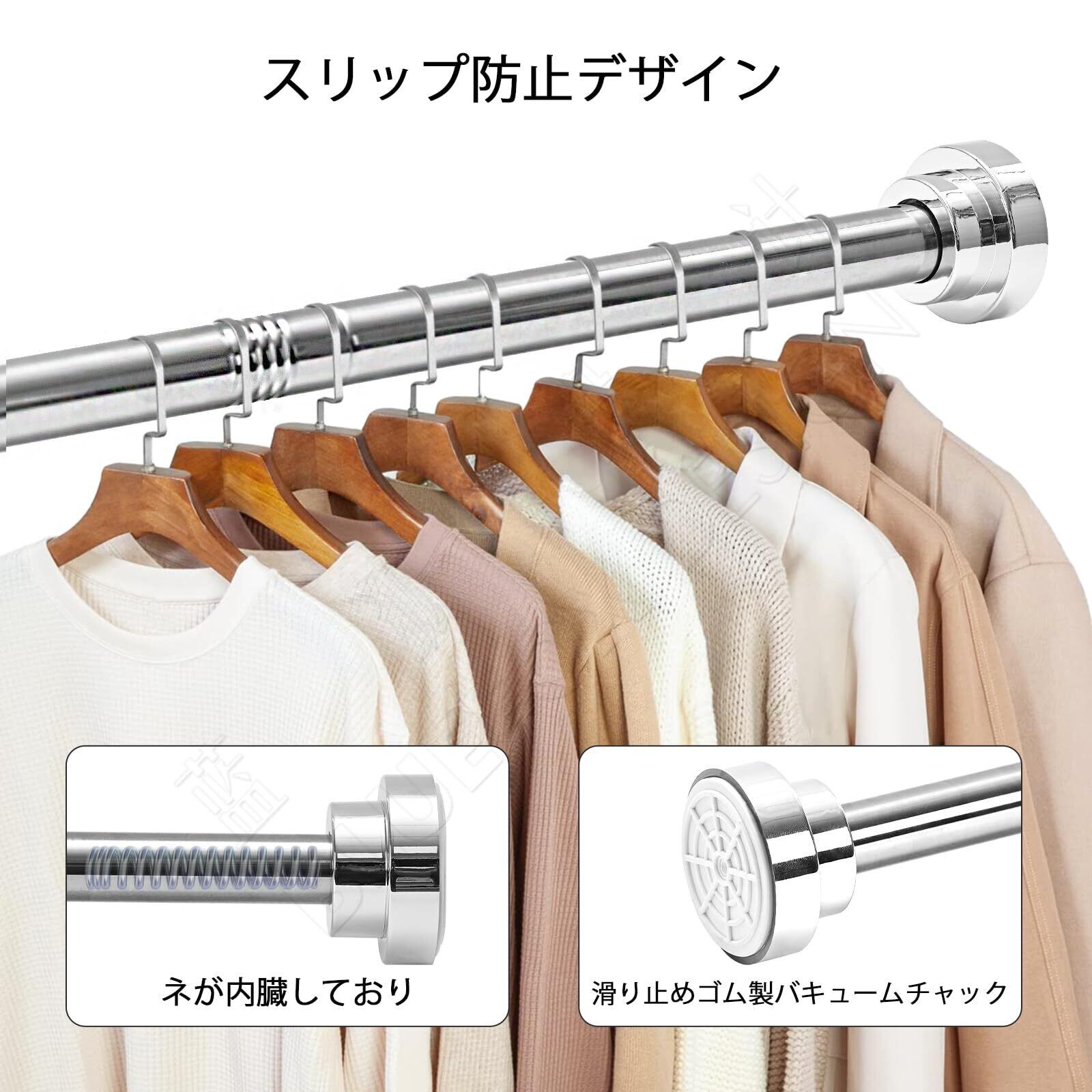 【優れた荷重能力】高品質な201ステンレス素材で製造されたつっぱり棒は強い荷重(40-10kg)に耐えられ、重い洗濯物干しや厚地のカーテンも楽々吊るせます。そして、伸縮棒は錆びが出ない上に、カビにも強いです。(ご注意:設置された長さが違うと、荷重能力は変わります。伸縮が少ない方がより荷重能力がもっとよいです)。