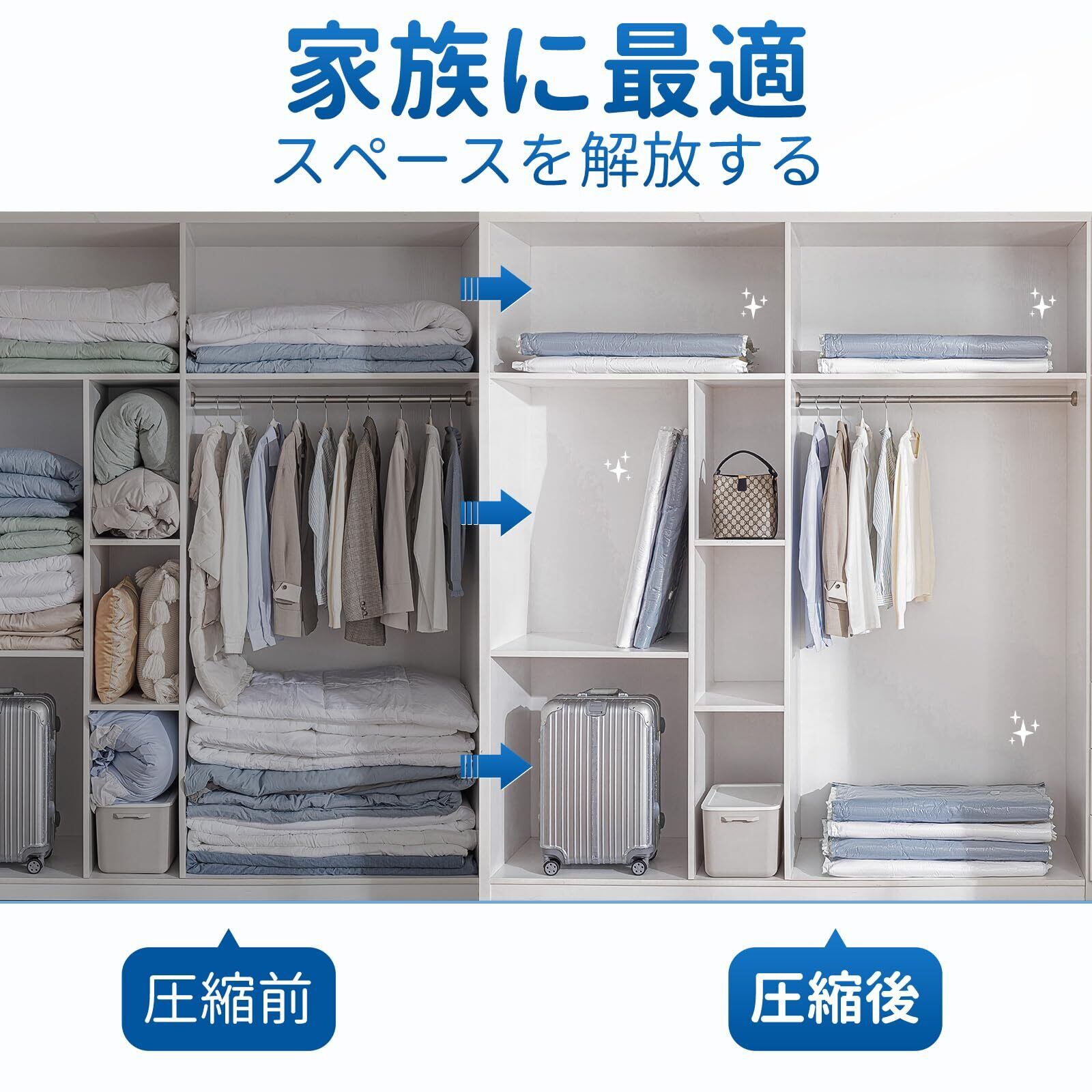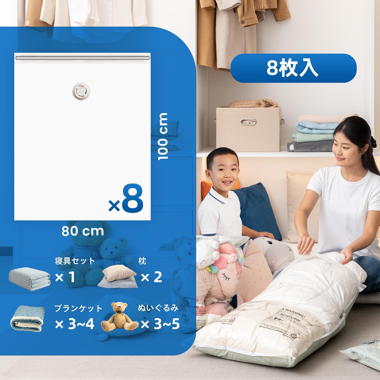 スペースの節約:サイズ:80 100 cm(8 枚) 真空圧縮袋は家庭の保管問題の解決に最適です。真空圧縮技術により、衣類、寝具、掛け布団、毛布、ぬいぐるみ、枕などをしっかりと圧縮することができます。 収納スペースを節約し、ワードローブやスーツケースをより整理整頓します
