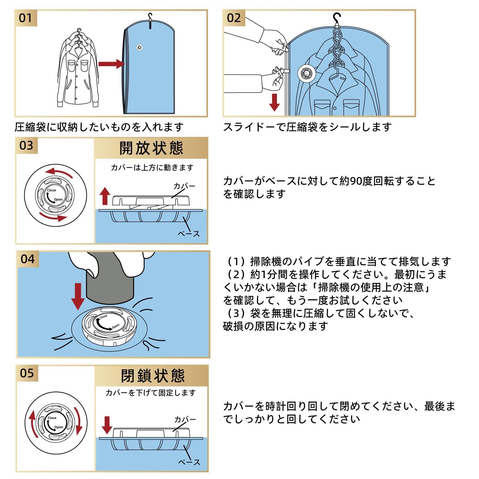 優れた衣類保護:この収納バッグは、密閉性が高く、真空状態が長くて、湿気、ほこり、カビ、虫、臭いから衣類を保護できます、衣類を変形やしわから保護します。ご家庭用の掃除機を使ってかさばる衣類をコンパクトにラクラク圧縮します。※お使いの掃除機の機種(ノズル)をよくご確認ください。掃除機の機種(ノズル)によっては、使用できない場合があります