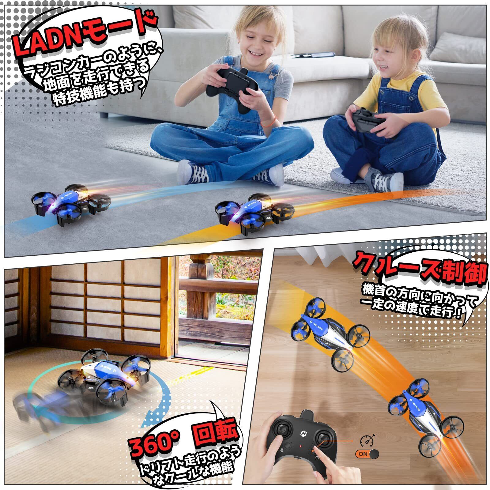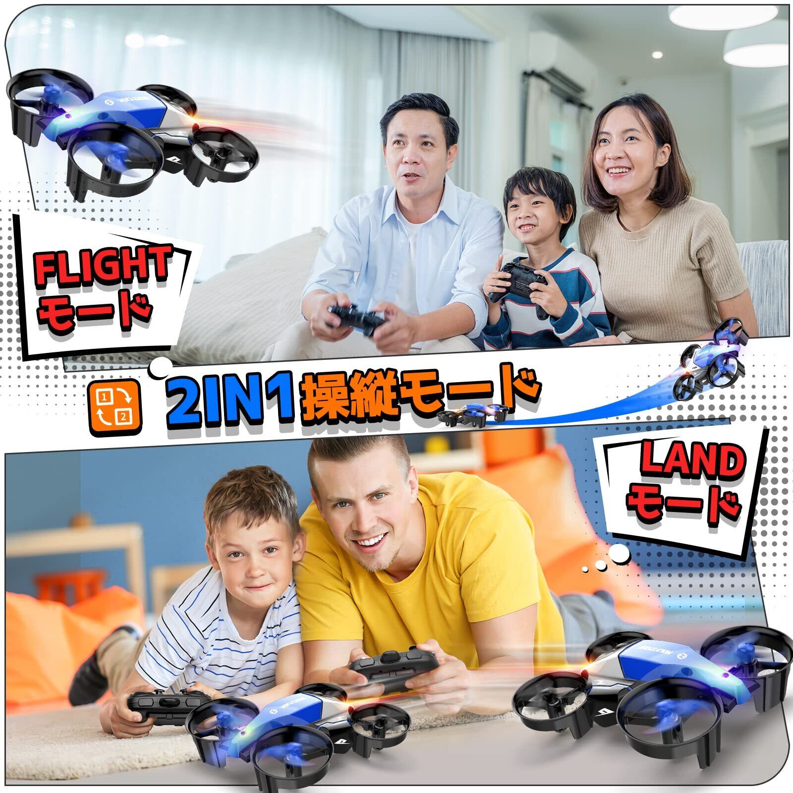 ✈【陸・空両用】2つの操作モード、2つの遊び方、陸・空両用ドローンがもっと楽しくなります!子どもへの面白いプレゼントに最適です。FLIGHTモードでは、本製品がドローンのように空を飛び、LANDモードでは、リモコンカーのように地上を走ります。