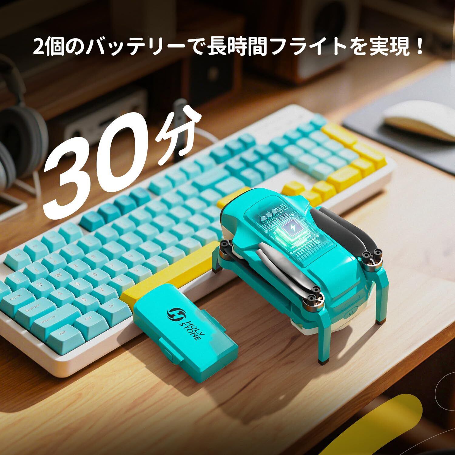 ぜひお楽しみいただきたいポイントは、2つのバッテリーで最大30分の飛行時間を確保していること。さらに、折りたたみ式のデザインにより、持ち運びが簡単。旅行やお出かけの際にも、スムーズに楽しめます。