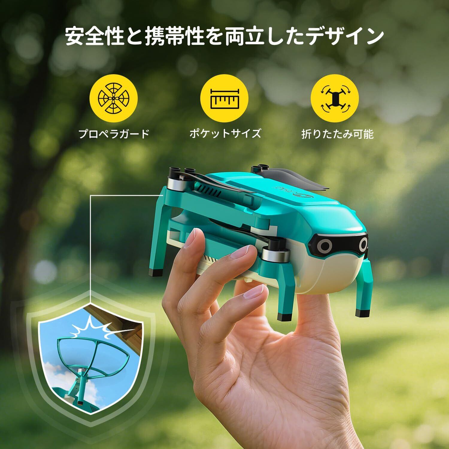 【初心者も安心の安全設計】ワンキー離陸・着陸に加え、トラブル時に即停止できる緊急停止ボタンを搭載。また、万が一の衝突から守るプロペラガードも付属しており、小さなお子様も安心して操作できる設計です。