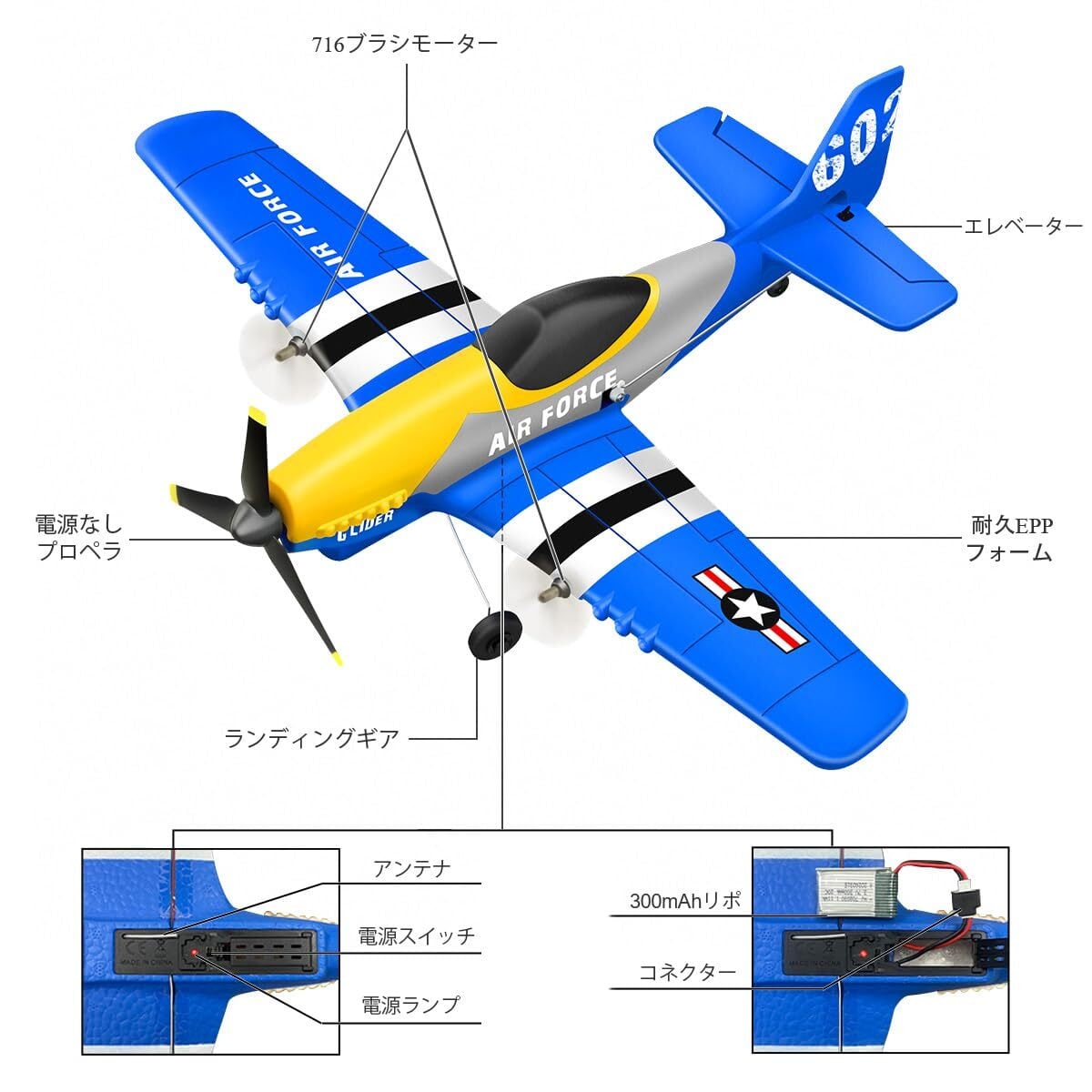 【強力モーターと2つのバッテリー】 飛行機は2つの強力なブラシ付きモーターを搭載し、パイロットは高速と低速を切り替えることができます。 充電式バッテリーが2個付属しています、 約40分のフライトが楽しめます (20分*2)。
