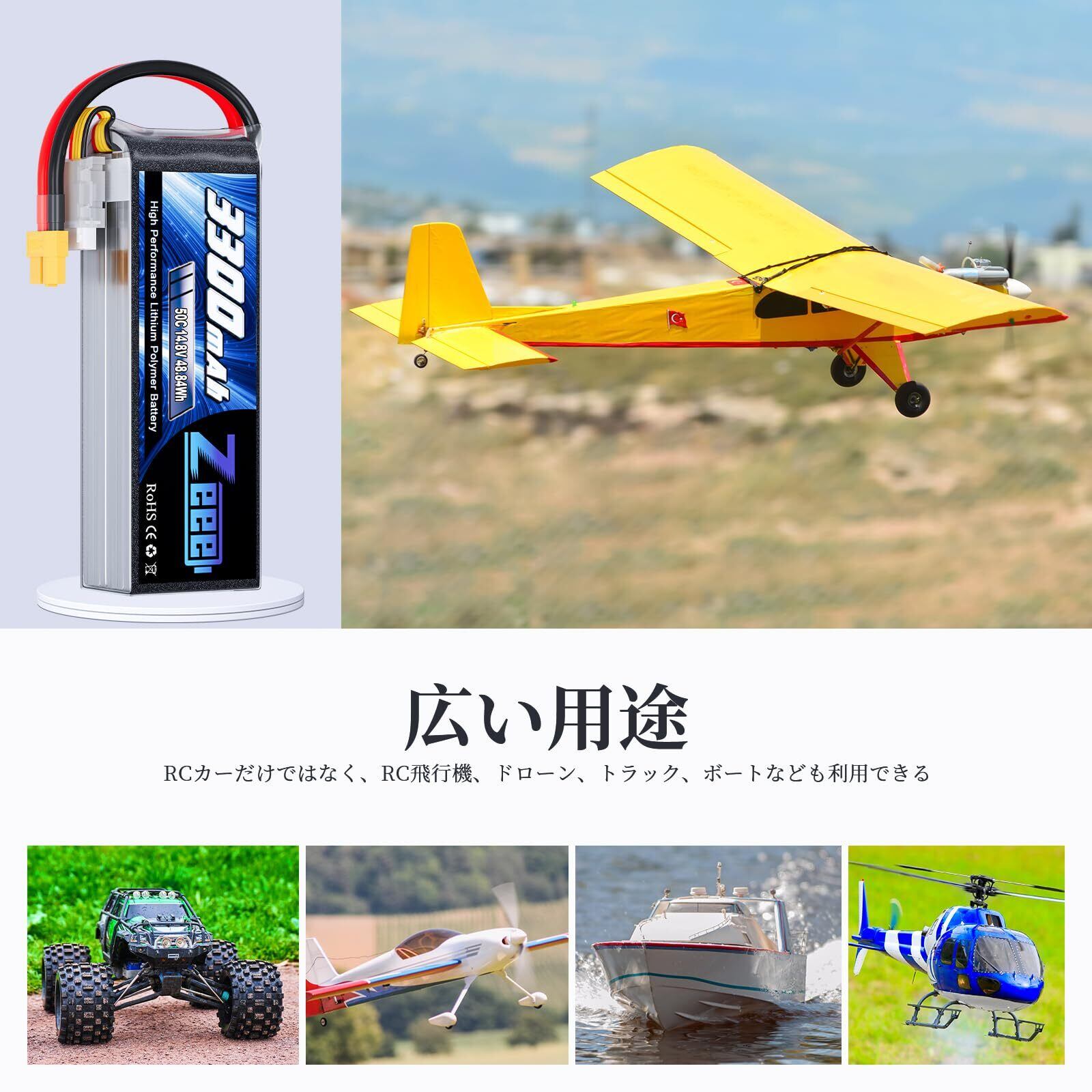 【高性能】ゼエエ(Zeee)14.8V 50C 3300mAh リポバッテリーは日本と韓国からの優れたリチウムポリマー素材があります。そして、最大のエネルギー密度が235Wh / kgまで。リポバッテリーはメモリー効果がないので、昼休みや時間がある時に充電しても、いずれ問題がないです。