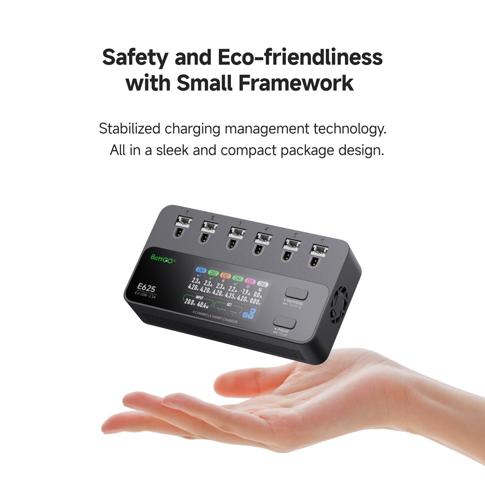 6ポート独立制御で「同時急速充電」可能! 最大2.5A / 10Wの高速充電で、6つのバッテリーを同時にフル充電!各ポートが独立して最適な電流を供給するため、効率的でムラのない充電が可能。