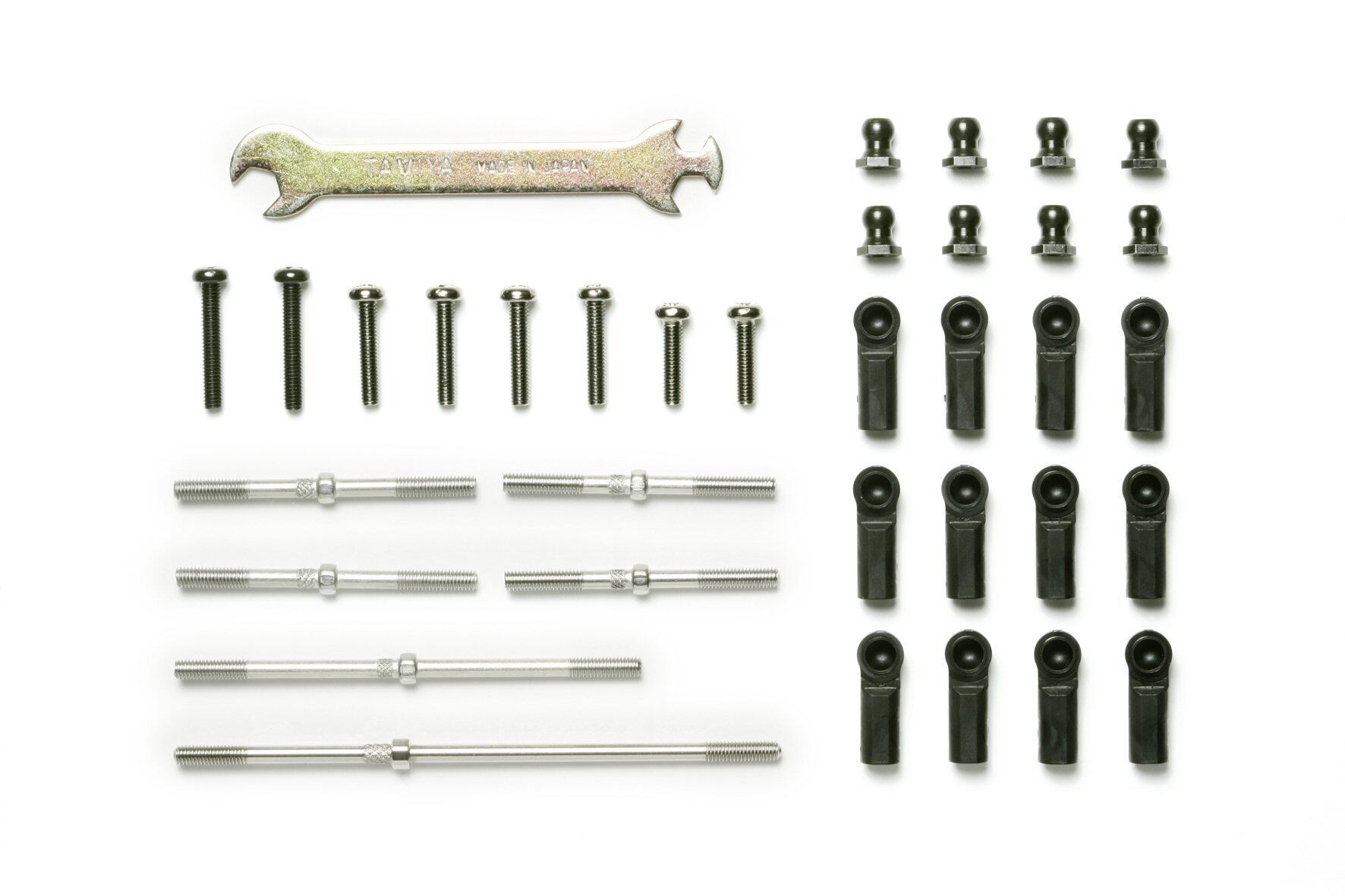 DT-02シャーシの前後アッパーアームとステアリングタイロッド用ターンバックルシャフトです。アジャスターをはずすことなく、付属の板レンチを使って長さが手軽に調整でき、キャンバー角やトーインセッティングが可能になります。3×42mm、3×38mmターンバックルシャフトを各2本、3×65mm、3×85mmターンバックルシャフトを各1本セット。DT-02シャーシ各車に適応。