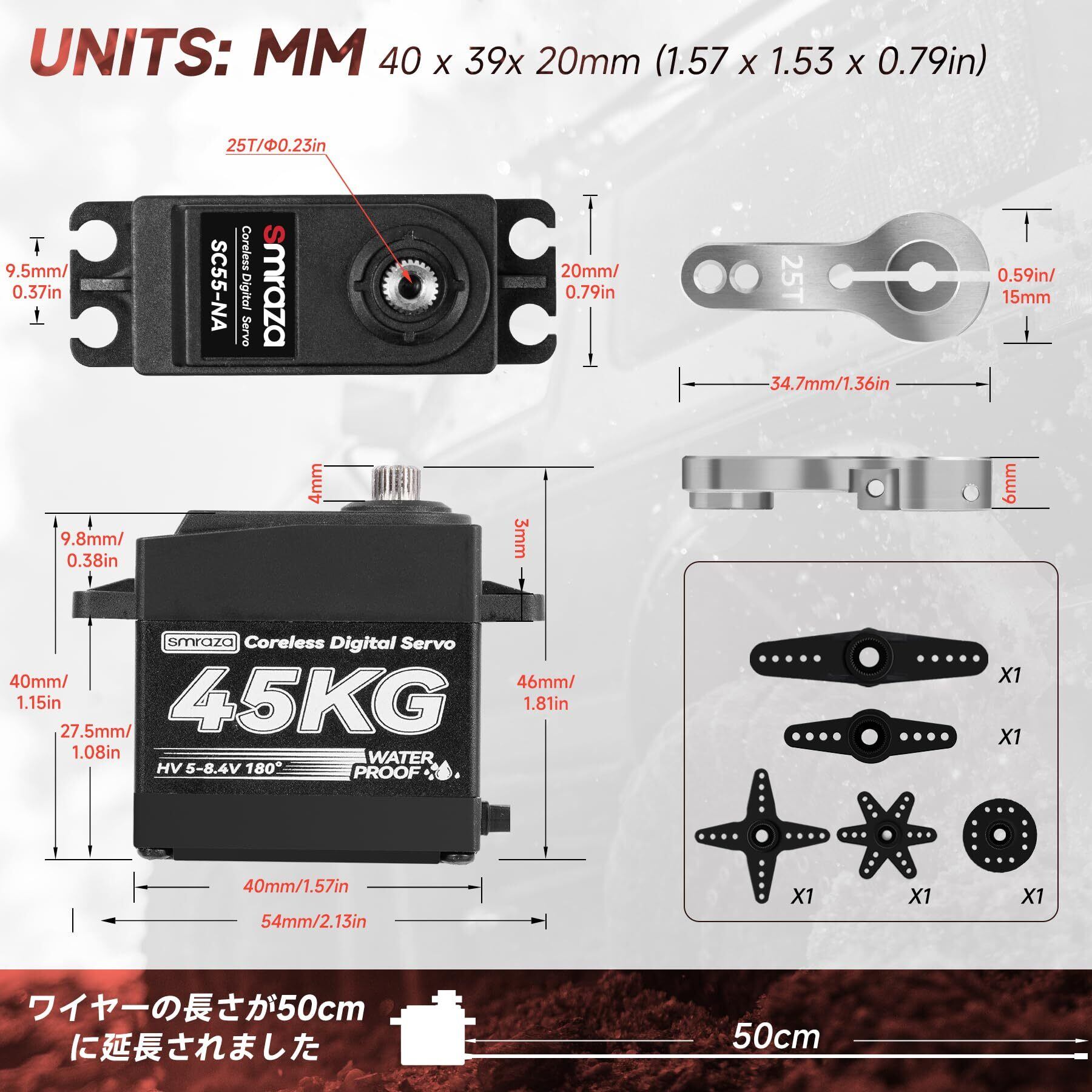 45KG コアレスサーボモーター 高トルクステアリング:Smraza 8.4V 防水サーボ デジタルフルメタルギアサーボ RC 1/10 1/8 1/12スケール 車 トラック クローラー/ロボット/ボート 25Tサーボホーン付き (180°)