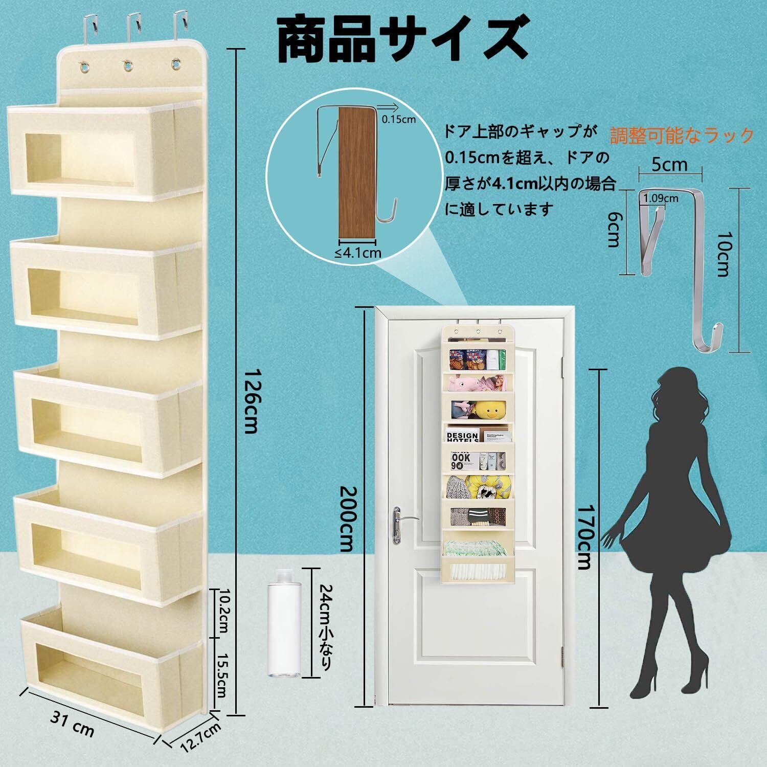 【5段の大容量と透明窓付きの設計】-- 五段のウォールポケットで、普通の製品より一つのポケットが多く、化粧品、ぬいぐるみ、タオルなど多くの雑貨を収納できます。透明窓付きの設計なので、収納されているものを見えやすく、財布やカバン、スカーフ、ヘアアクセサリー、おもちゃ、雑誌 などの出し入れも便利です。サイズ(折りたたみ):32×27×7cm。サイズ(展開):126×31×12.7cm。