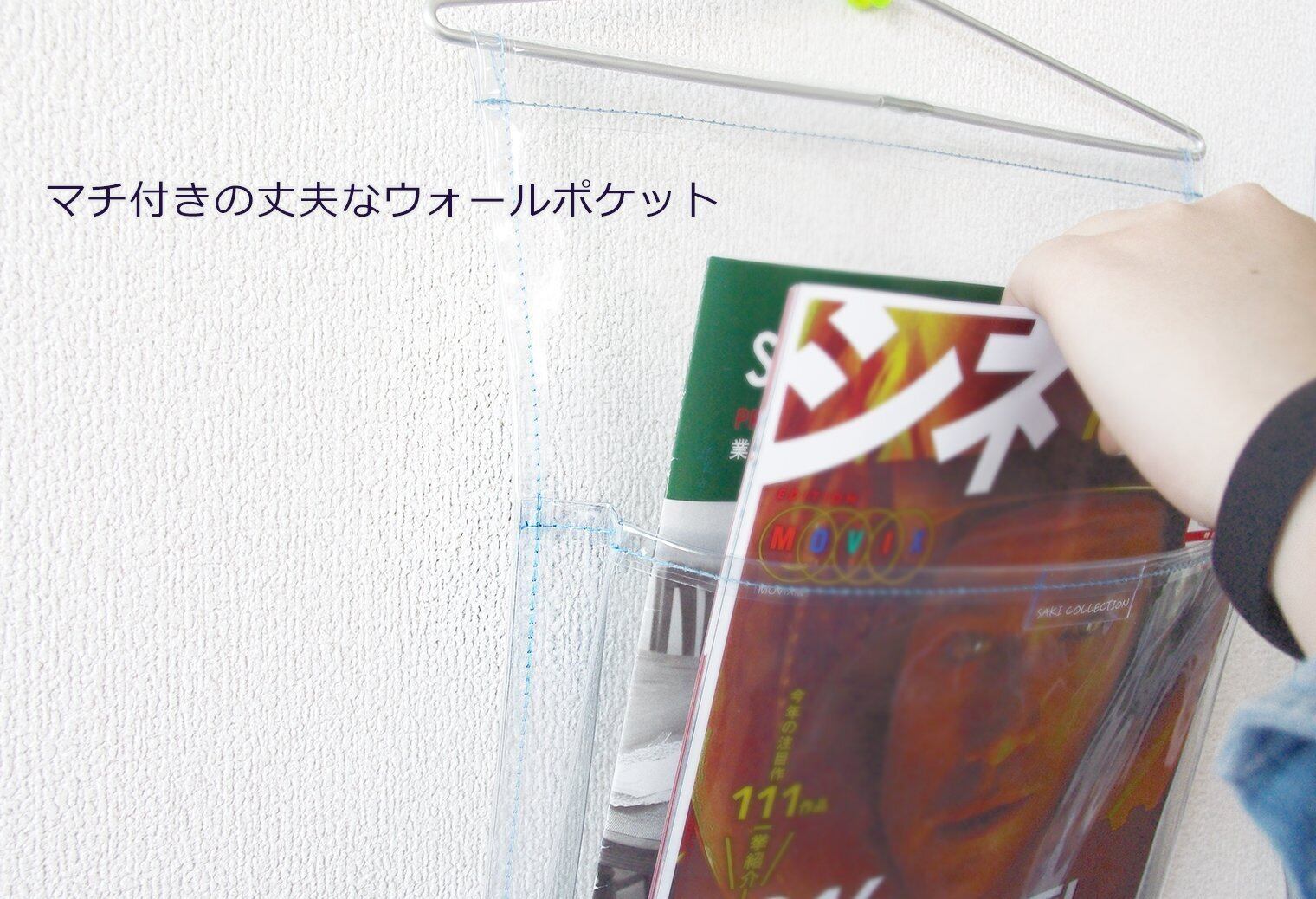 ポケットは1個。A4サイズのパンフレットがタテに入るサイズ。仕切りなしなので、ポンポンといろいろ入れるには最適。厚みのあるしっかりしたビニールを使っています。クリアーな透明。ビニール素材。横幅約27.5cm高さ約37.5cm ポケット1つの大きさは横約25.5cm縦約24cm、三角形のスチール金具付き、フックなどに掛けてお使いください。