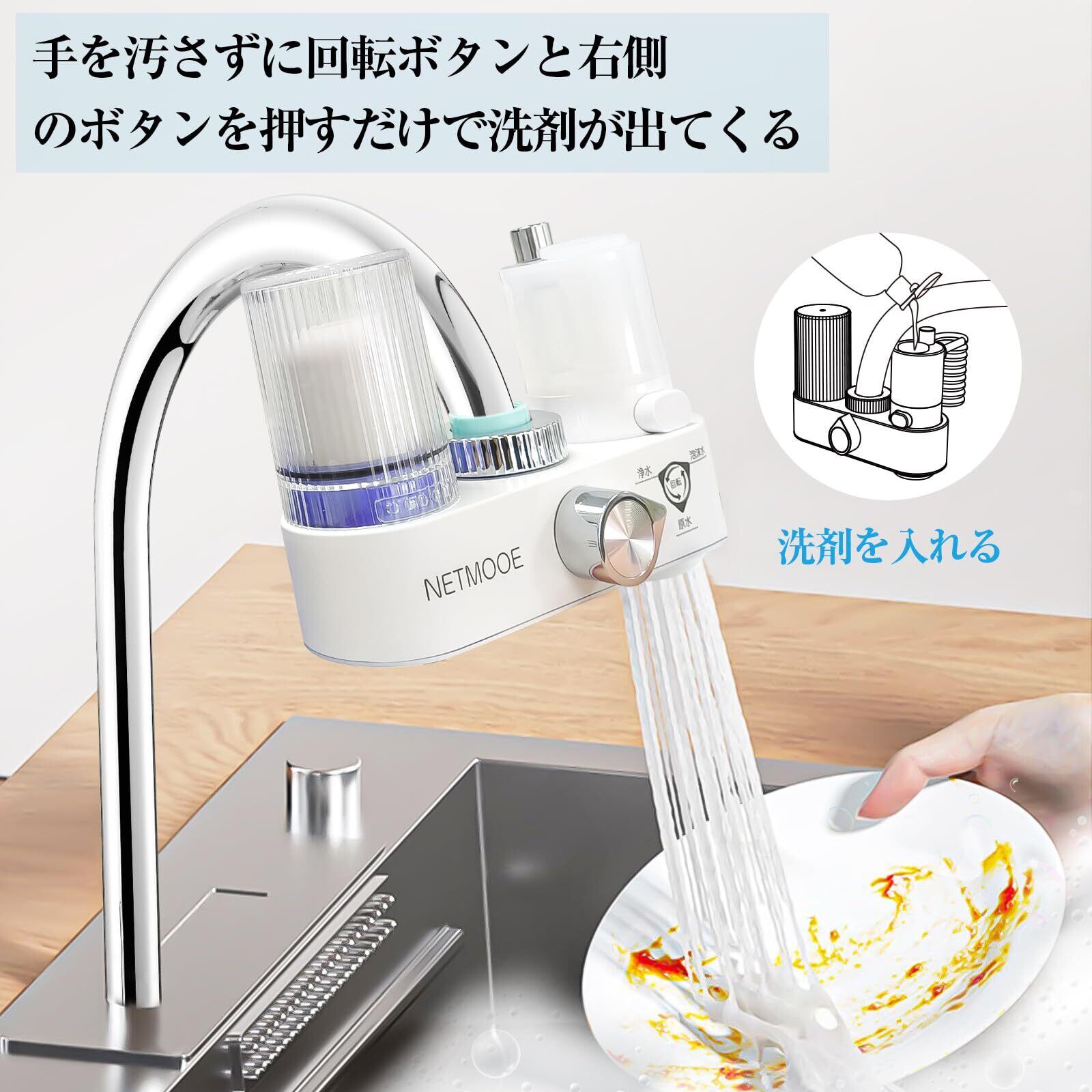 【3段階に切り替え可能】浄水(シャワー)、原水(シャワー)、泡沫水(シャワー)を用途に合わせて簡単切り替えられます。【浄水シャワー】 野菜洗いやお米とぎ、料理に最適。【原水シャワー】お手洗いに最適。【泡沫水シャワー】 食器洗いに最適。洗剤を入れる容器付きで、手を汚さずに回転ボタンと洗剤を入れる容器にあるボタンを押すだけで洗剤が出てきます。食器洗いや手洗いが便利になります。
