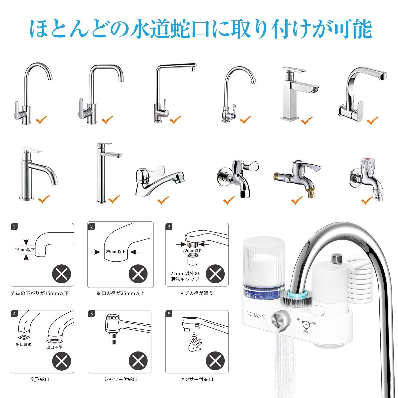 【付属内容&取り付け簡単】①本体1個、②カートリッジ1個、③取付用アダプタセット、④カートリッジ清掃用紙やすり1枚、⑤取扱説明書【取り付け簡単】4タイプ水栓に対応しており、工具不要で簡単取り付け可能になります。Aタイプ:先のふくらんだ丸型水栓、Bタイプ:外ネジタイプの水栓、Cタイプ:内ネジタイプの水栓、Dタイプ:先がストレートの水栓