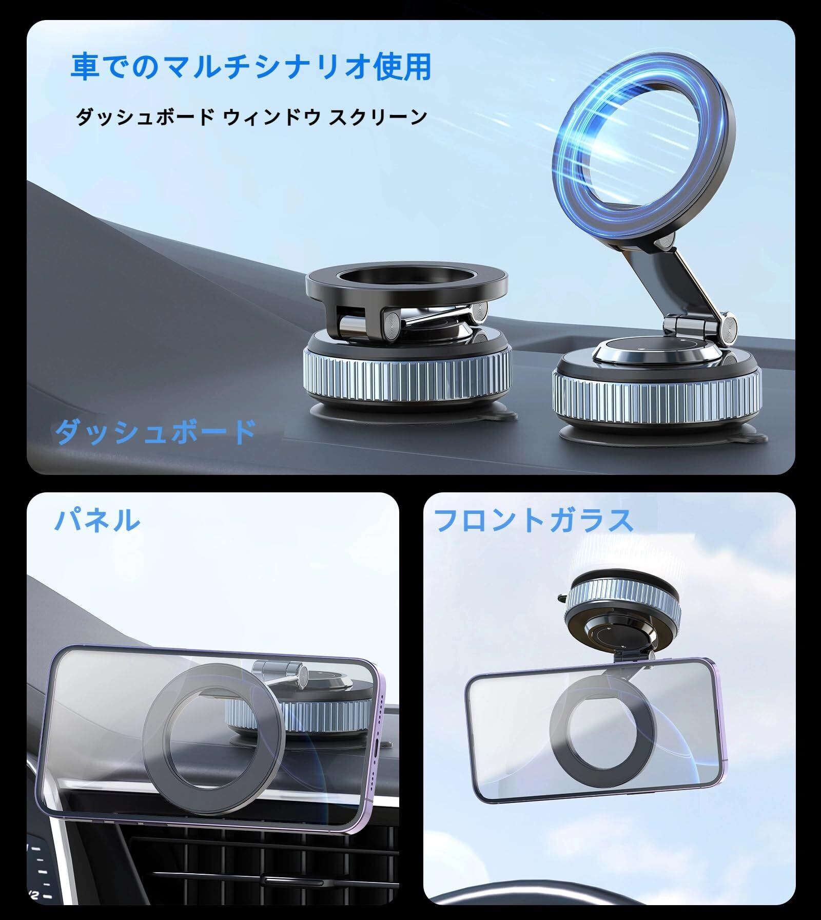 車載 スマホホルダー 車 マグネット 360° 回転 車載 スマホスタンド マグセーフ 真空吸盤 高級合金素材 携帯スタンド 片手操作 フロントガラスやテーブルに適用 iPhone/Androidに対応