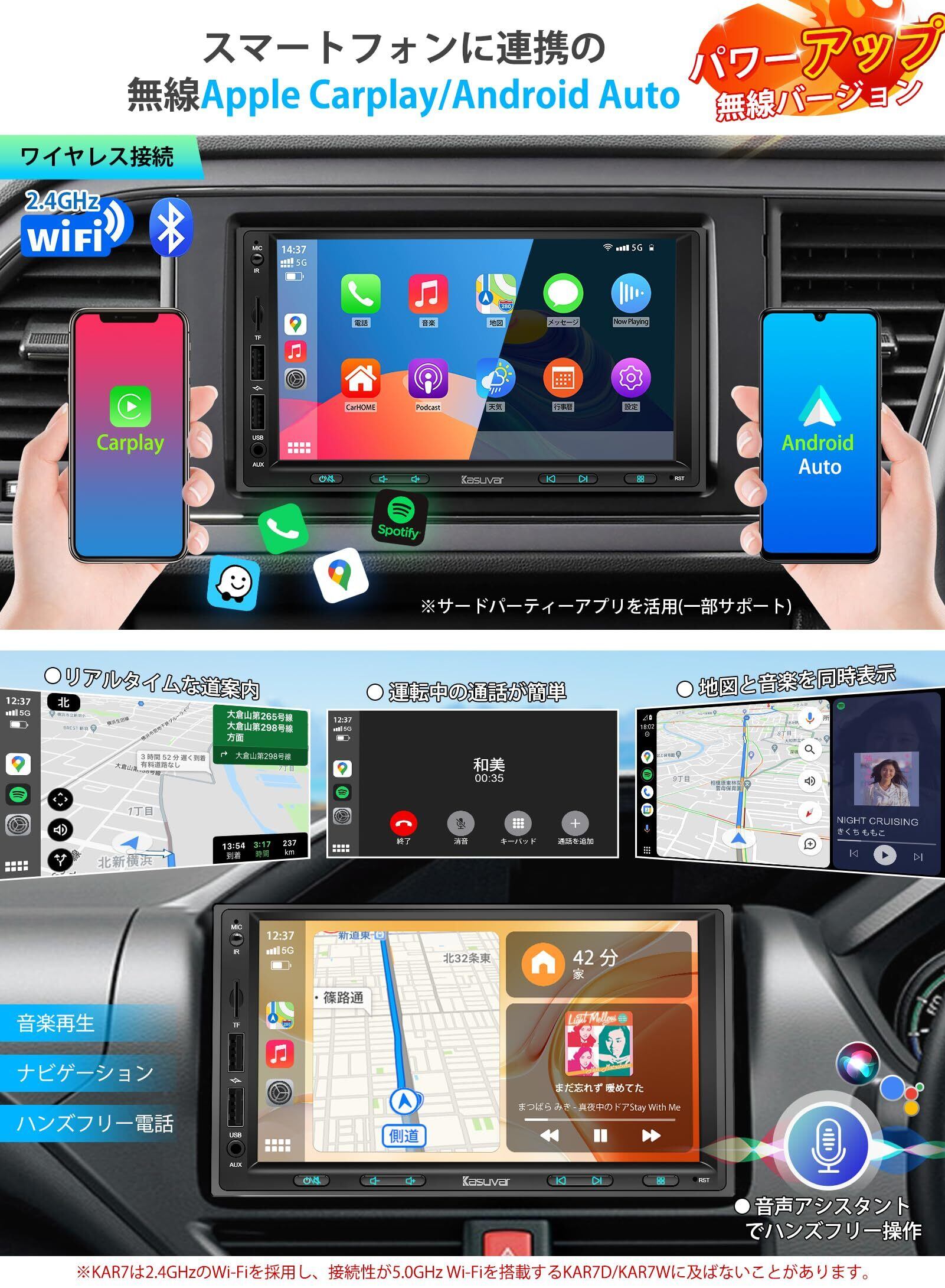 NEW!【2.4GHz WIFIとBluetooth経由の無線式にUP】KAR7はiPhone及びAndroid端末と接続することで音楽再生、電話やナビ案内などが使用できる「AppleCarPlay」「AndroidAuto」に対応します。一部の携帯アプリをオーディオ大画面に表示するのはもちろん、音声コントロール機能「Siri」「Googleアシスタント」を使用して、音楽・ラジオ再生、通話、スケジュール管理、ナビゲーション、周辺スポットのチェックなどをハンズフリーで操作することもできます。