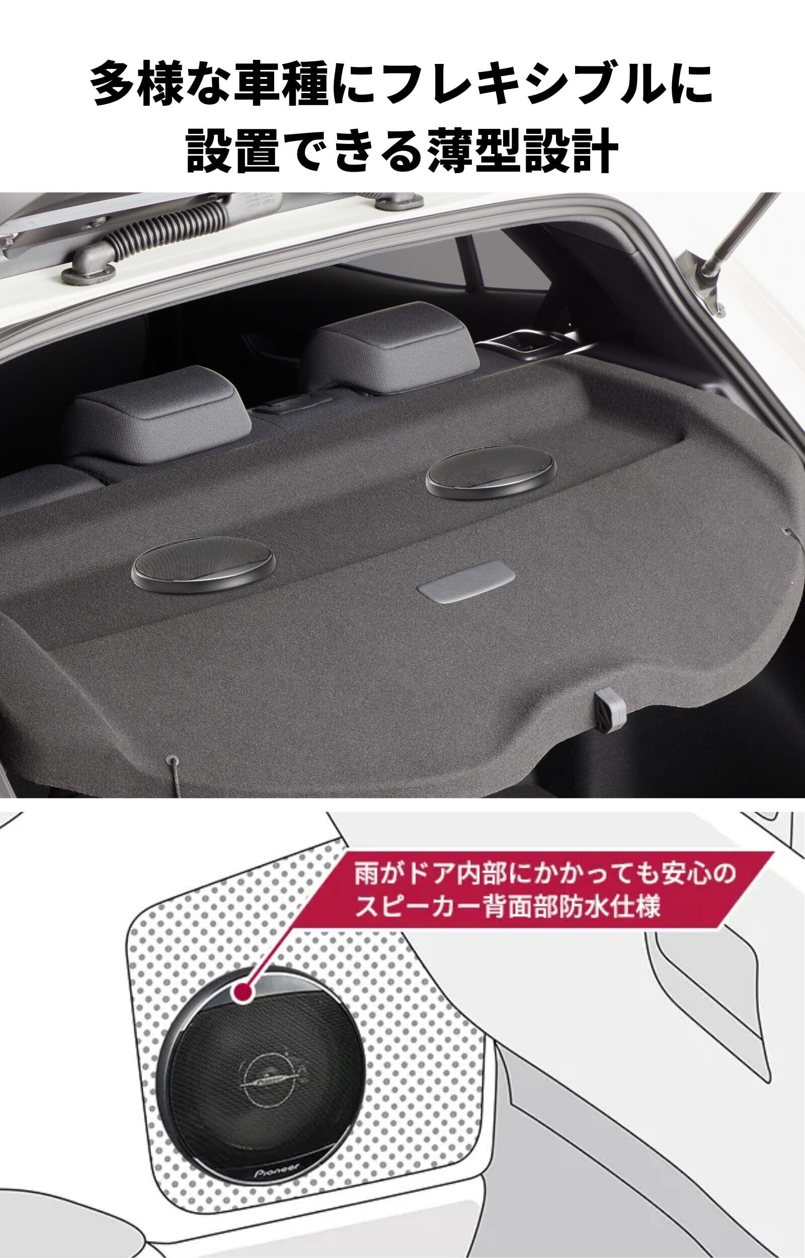 さまざまな車種に取付けられる薄型設計、ドア用スピーカーとして設置する際も安心な防水仕様