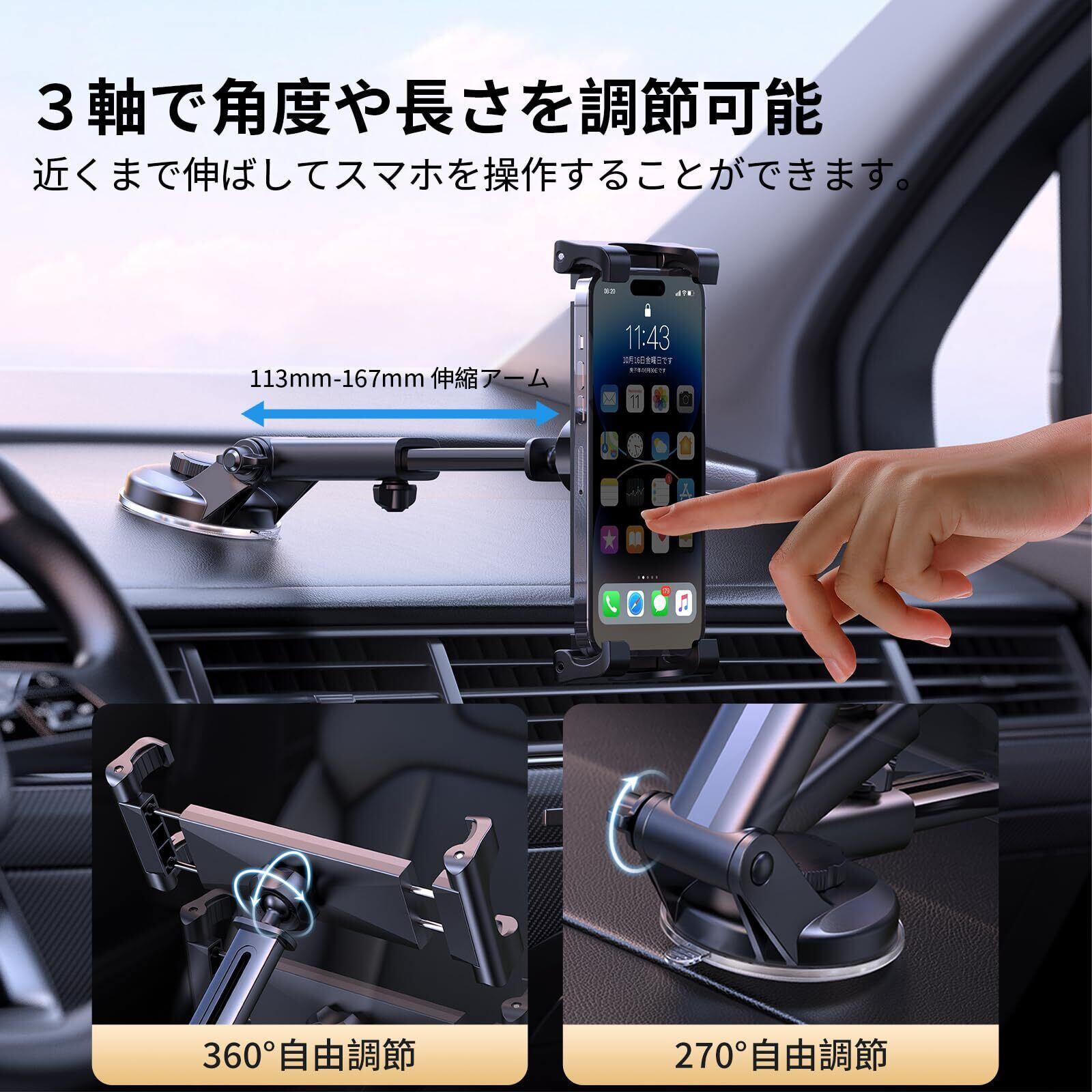 【 360度回転 & 伸縮アーム 】車 スマホホルダー はアーム機能があり、アームの上下位置を変更できるだけでなく、前後に伸ばすことも可能!最大約17cmまで伸縮可能なので、近い位置までスマホを移動できます。タブレットホルダー 車 は360度回転できるボールジョイントより、スマホを360度回転できます。音楽操作時はスマホを縦置き、ナビ利用時は横置きにするなど、利用シーンに応じて画面の向きを調整できます。
