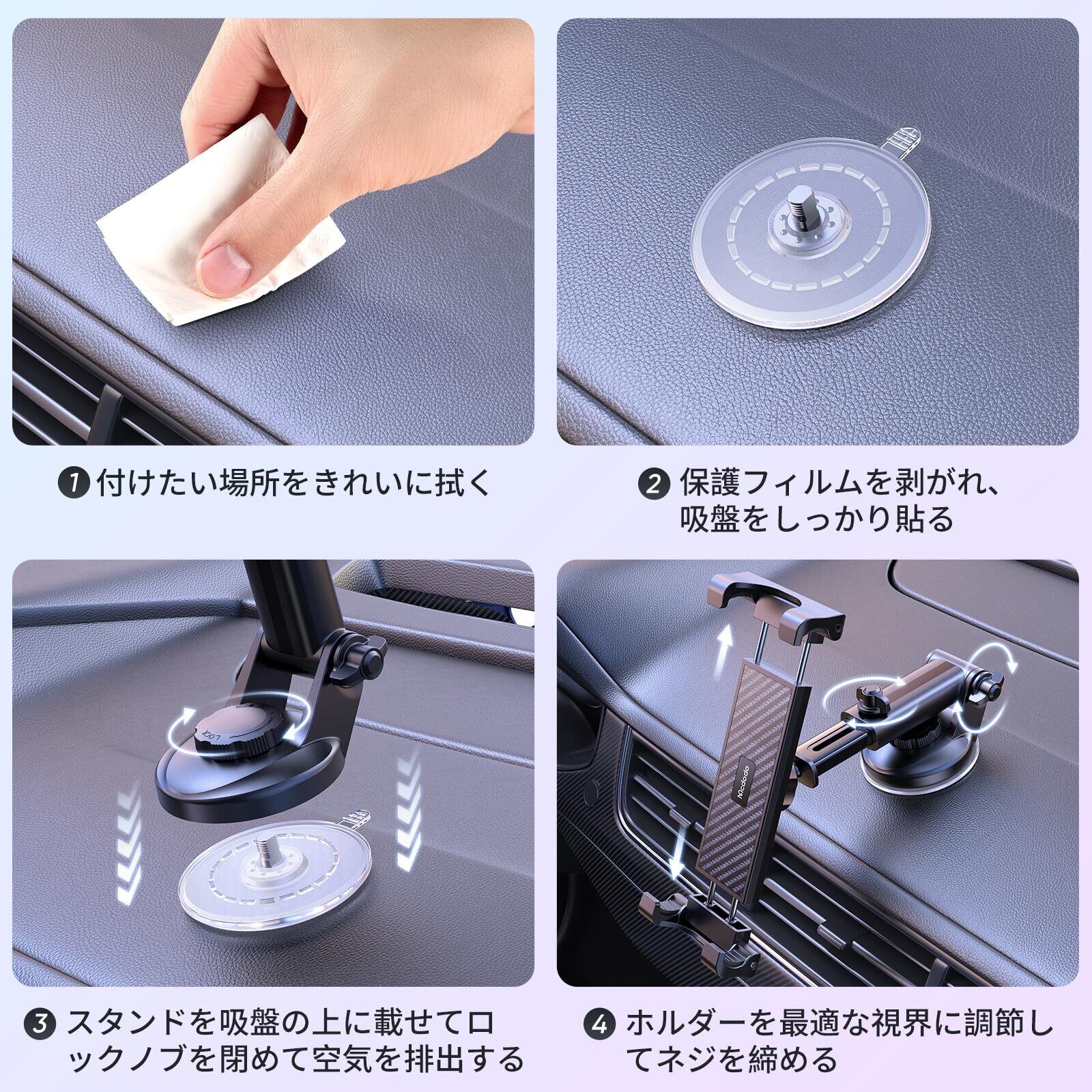 【 高い粘着力 & 安定性抜群 車載タブレットホルダー 】ゲル吸盤自体の粘着の他、真空吸着技術も採用され、 圧力ロックノブを回転すれば強力な吸引により本体をしつかり固定。タブレット スタンド 車 の最大吸着能力25kgとホルダーの力は強く、走行中にスマホが落下する心配もないため、安心して運転に集中できます。ipad 車載ホルダー は耐高温試験をクリアし、暑さに強く、夏場でもは吸着力が落ちません。