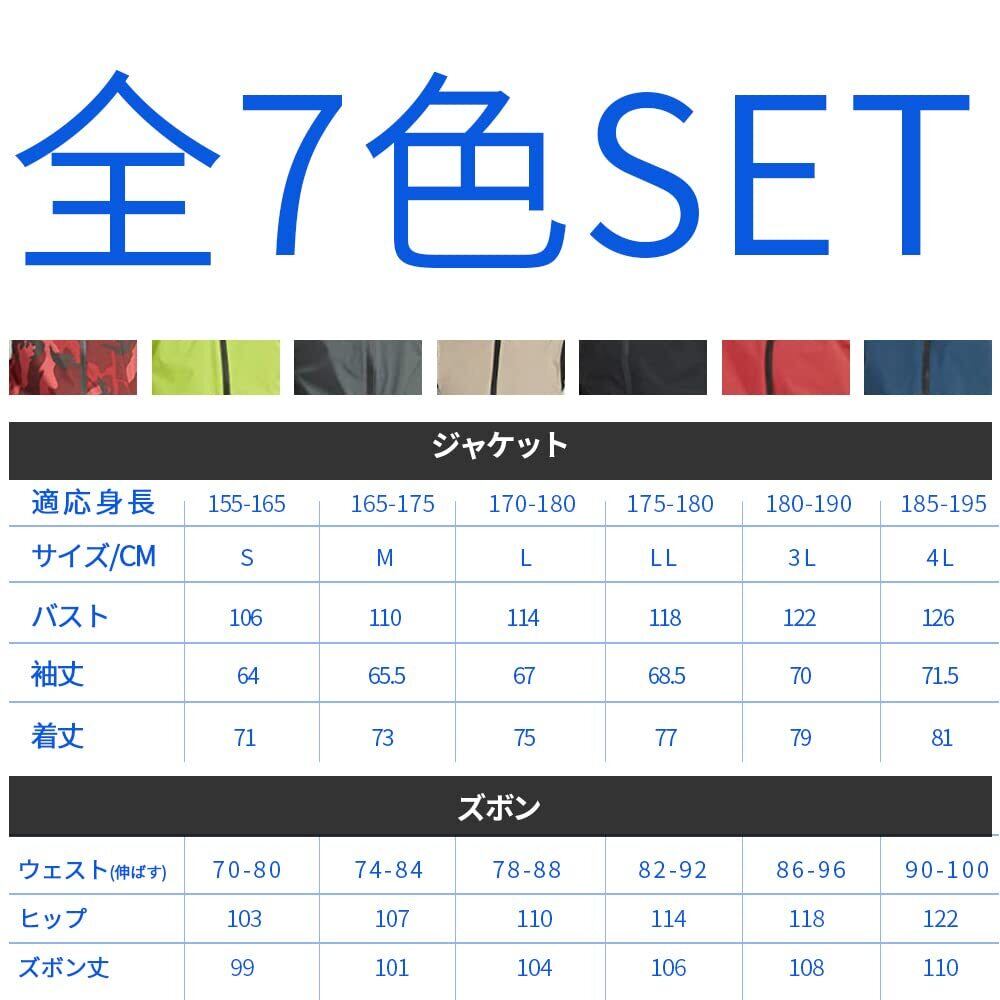 【超防水・仕様】両面防水を備えたレインスーツ、縫い目に特殊な加工を施し、防水性を高め、豪雨であっても水の浸入を強力に防ぐ。フードは着脱でき、首元のドローコードでフィット感調整可能、ズボンは前開きです。マジック調節を二の腕と裾に備え&ズボン裾部分に面ファスナー、ボタンで幅が調整でき、防水性能をより理想的になります。