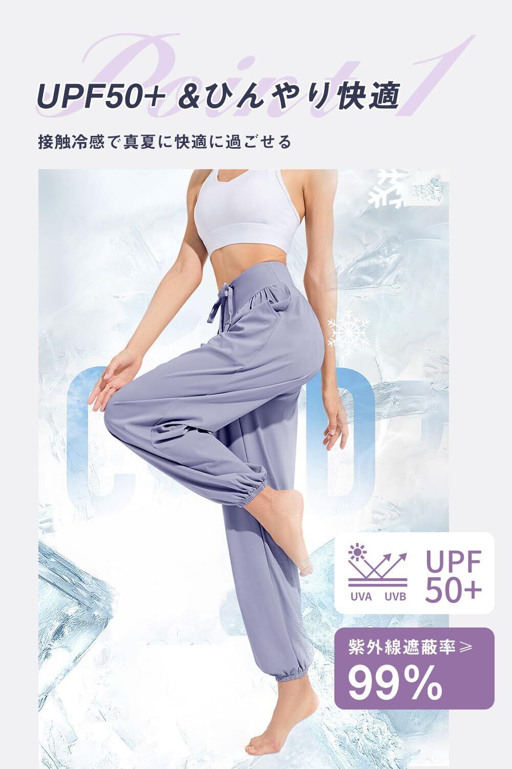 【接触冷感・UVカット】穿くだけで涼しい、夏の常識を覆したゆったりヨガパンツ!UVカットで紫外線のダメージから肌を守り、そのまま外出しても安心のUVケア仕様です。通気性・吸汗速乾性が良い素材を採用し、汗や水を素早く発散し、いつでもべたつかず、さらりとした快適な着心地をキープ!滑らかな肌触りで暑い日でも快適に過ごせます。