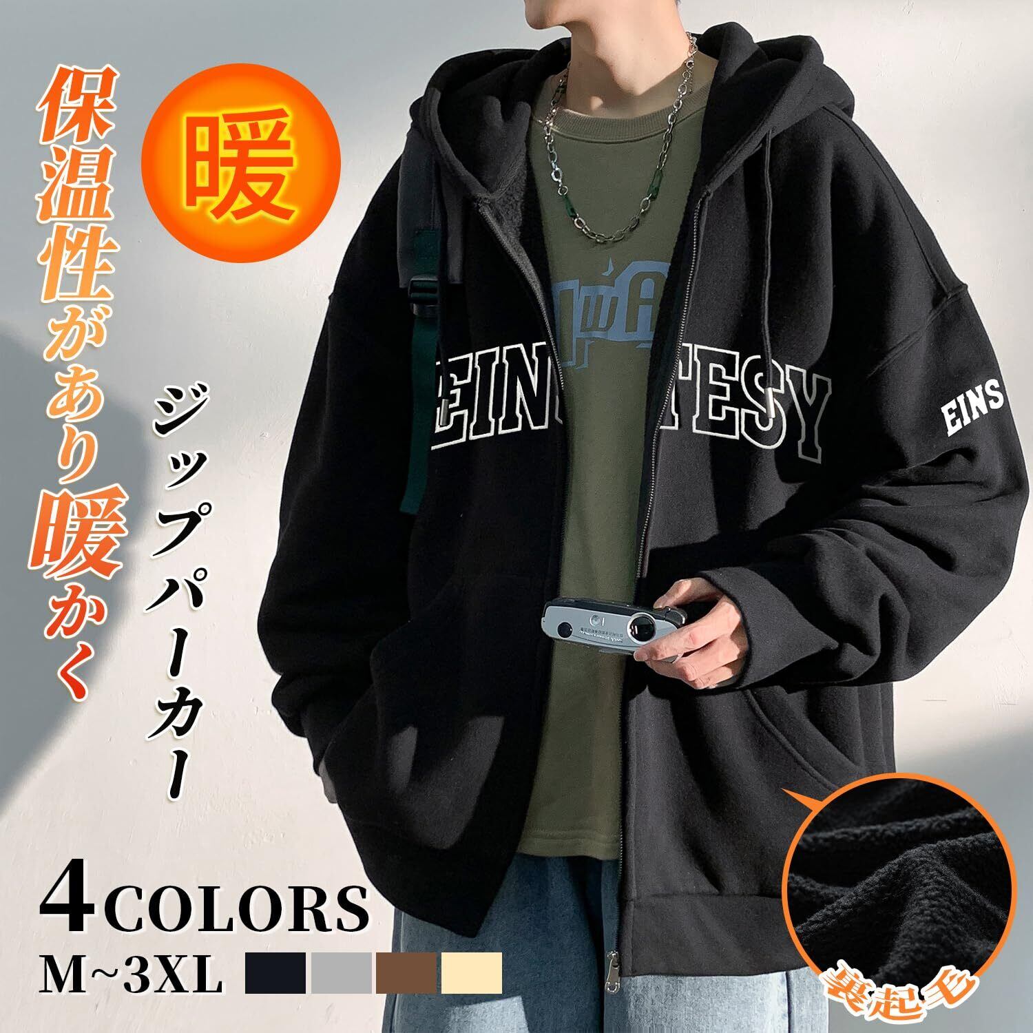【新着商品】[Fasshonrida] ジップパーカー メンズ 裹起毛 秋冬服 防寒 保温 ジップアップパーカー あったか ZIP 上着 フルジップ アウター フード付き ぱーかー おしゃれ サガラ刺繍 英字ロゴ 服 大きいサイズ 秋 冬 春