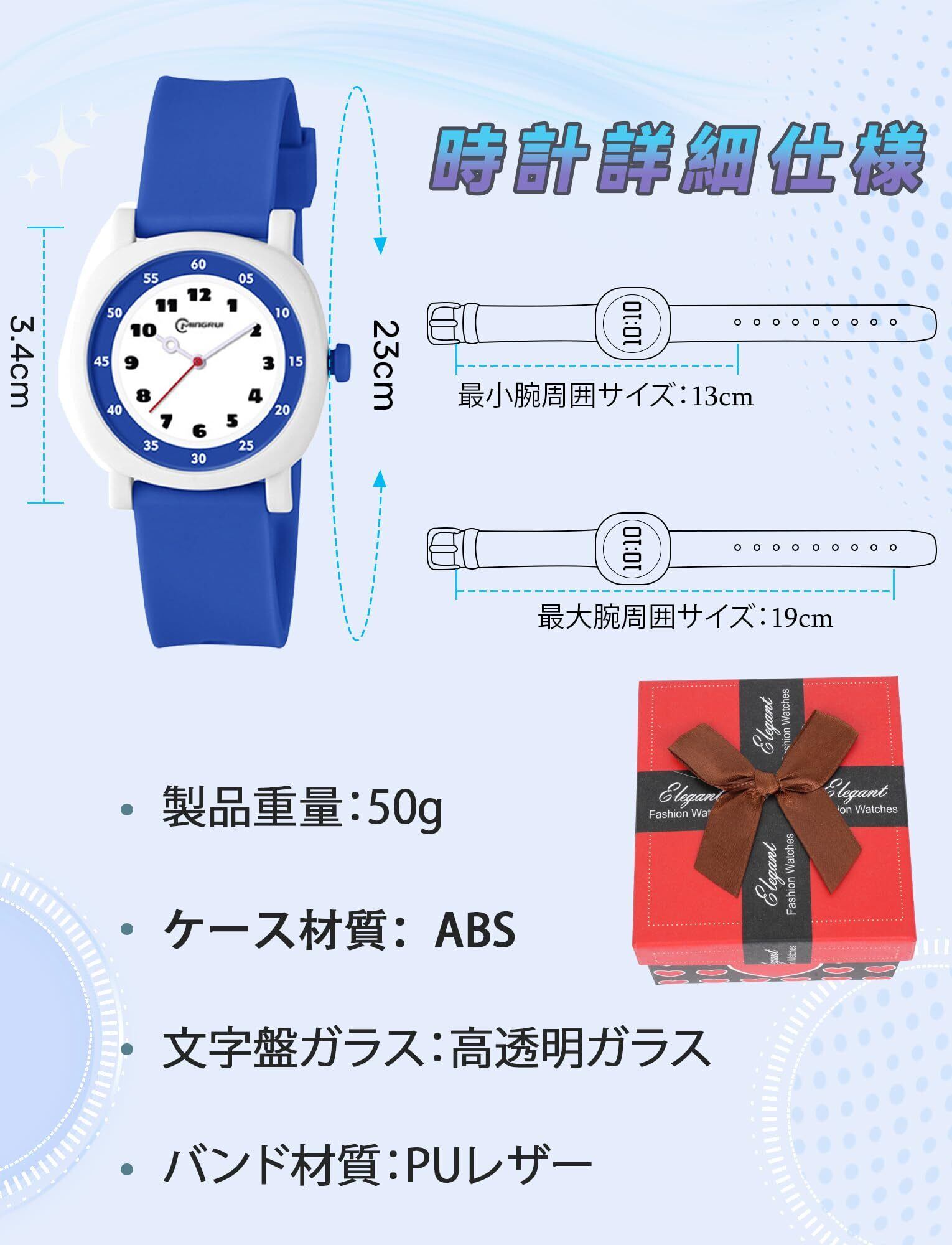 この腕時計は、入学祝い、誕生日、特別なお祝いなど、様々なシーンで喜ばれる贈り物です。可愛いブルーのデザインが、男の子にも女の子にも似合い、楽しい思い出を作る手助けをしてくれるでしょう。ご購入前には、手首周りのサイズを確認して、ぴったりのサイズをお選びください。