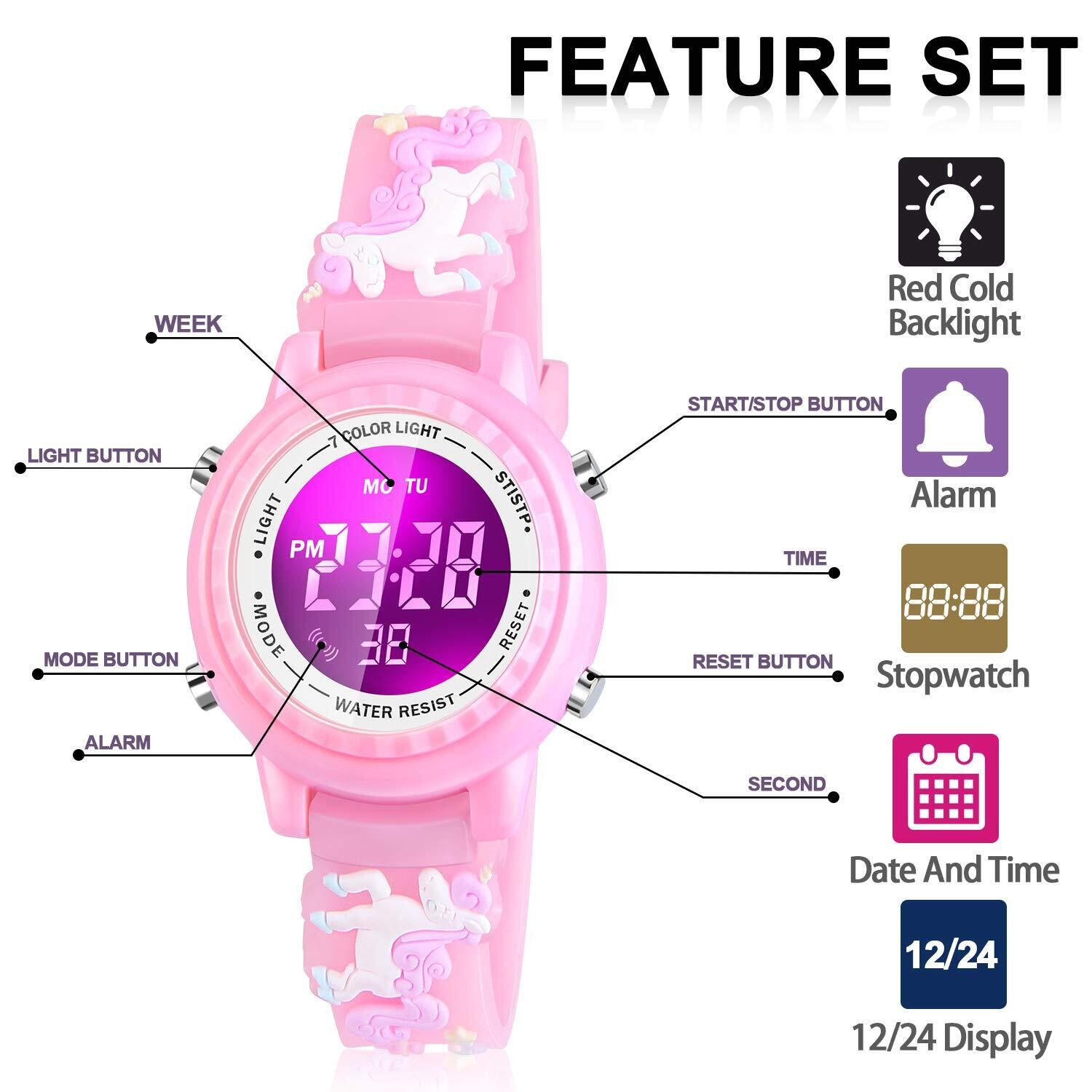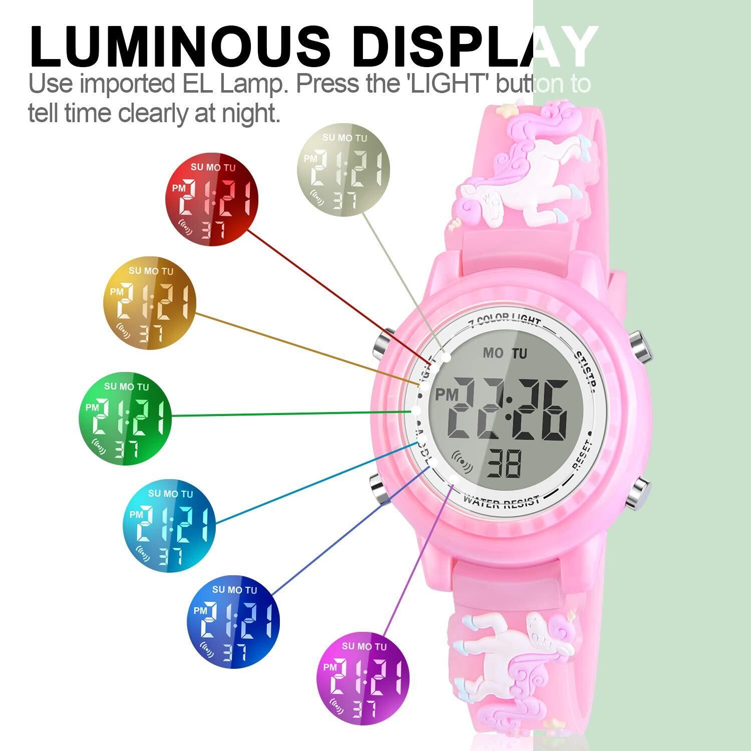 読みやすい:7つのカラフルなLEDバックライト、大きな文字盤と数字。 左側のバックライトボタンを3秒間押すだけで、7つのバックライトカラーが調整できます。 子供の好奇心を満足させるだけでなく、夜間の時間もはっきりと見ることができます。