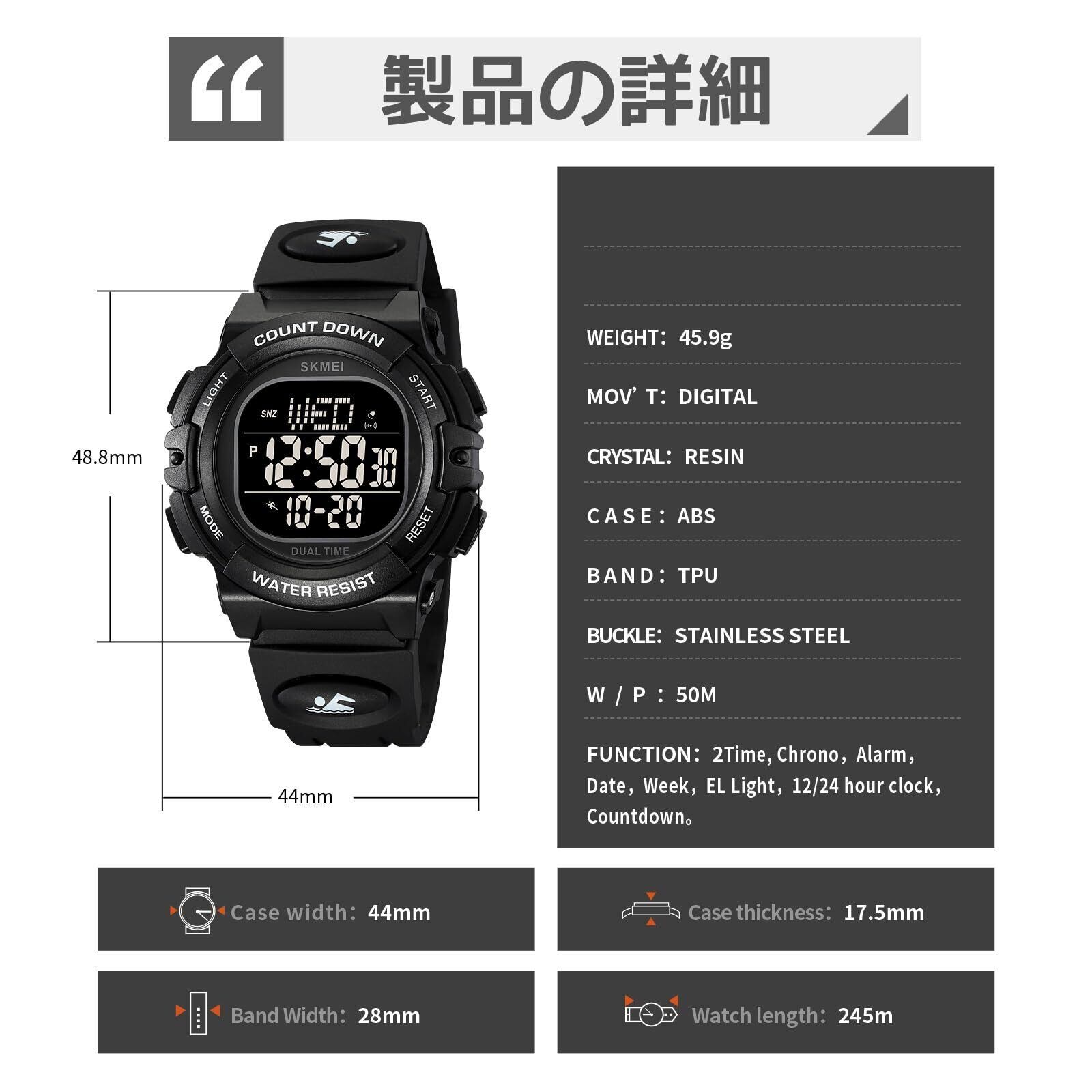 機能:アラーム、ストップウォッチ、カウントダウン、デュアルタイム表示、時報、LEDライト、12/24時刻表示、日付曜日表示、5ATM防水(手洗いの水滴、雨がかかる程度は大丈夫ですが、水仕事、水泳、シャワー、水に浸ける等には対応していません)