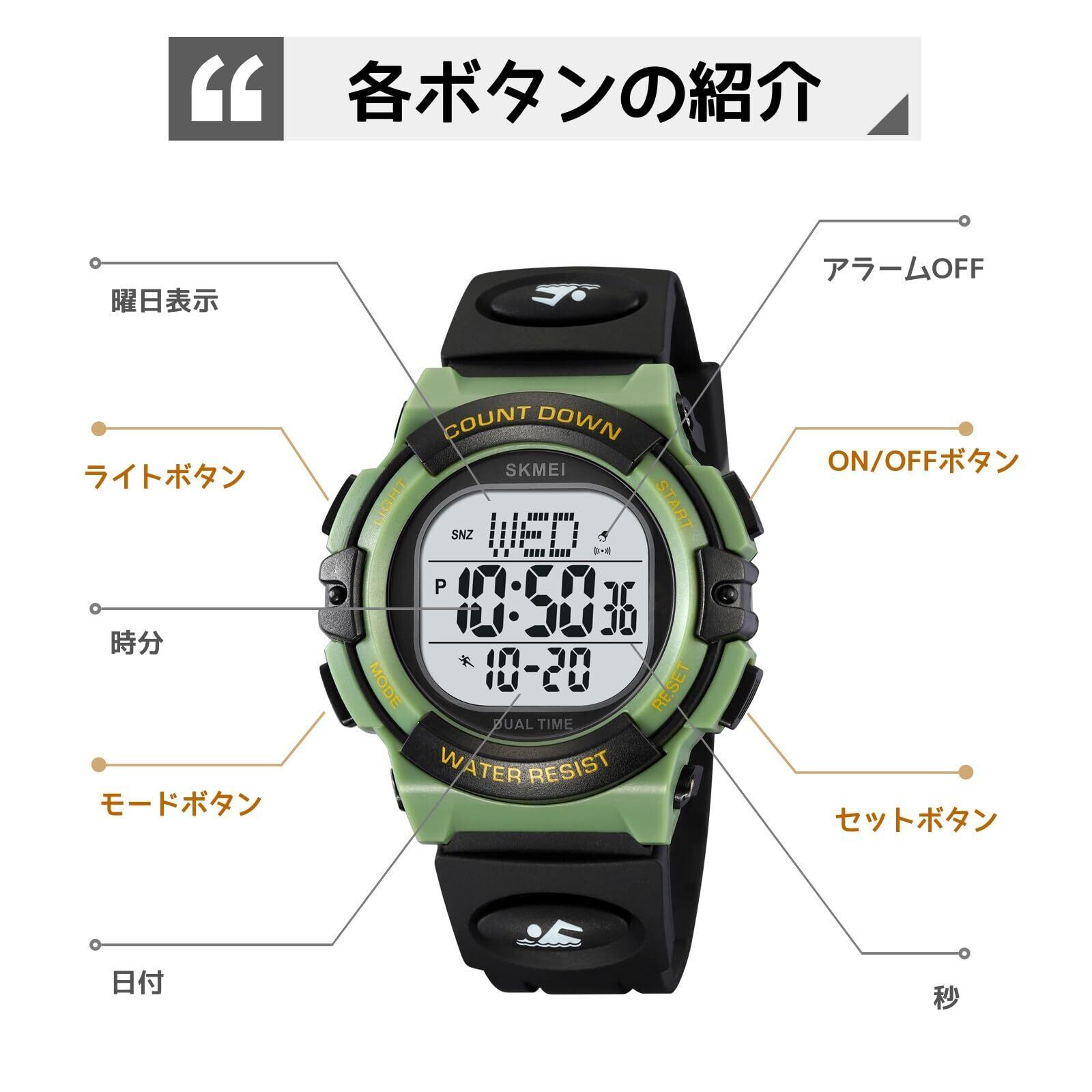 目覚まし時計やストップウォッチ、カウントダウン機能など、毎日の生活を便利にサポートする多機能を搭載しています。日付や曜日の表示も可能で、時間の管理を楽にする一品です。また、カジュアルなグリーンカラーが目を引き、お子様のファッションにもマッチします。