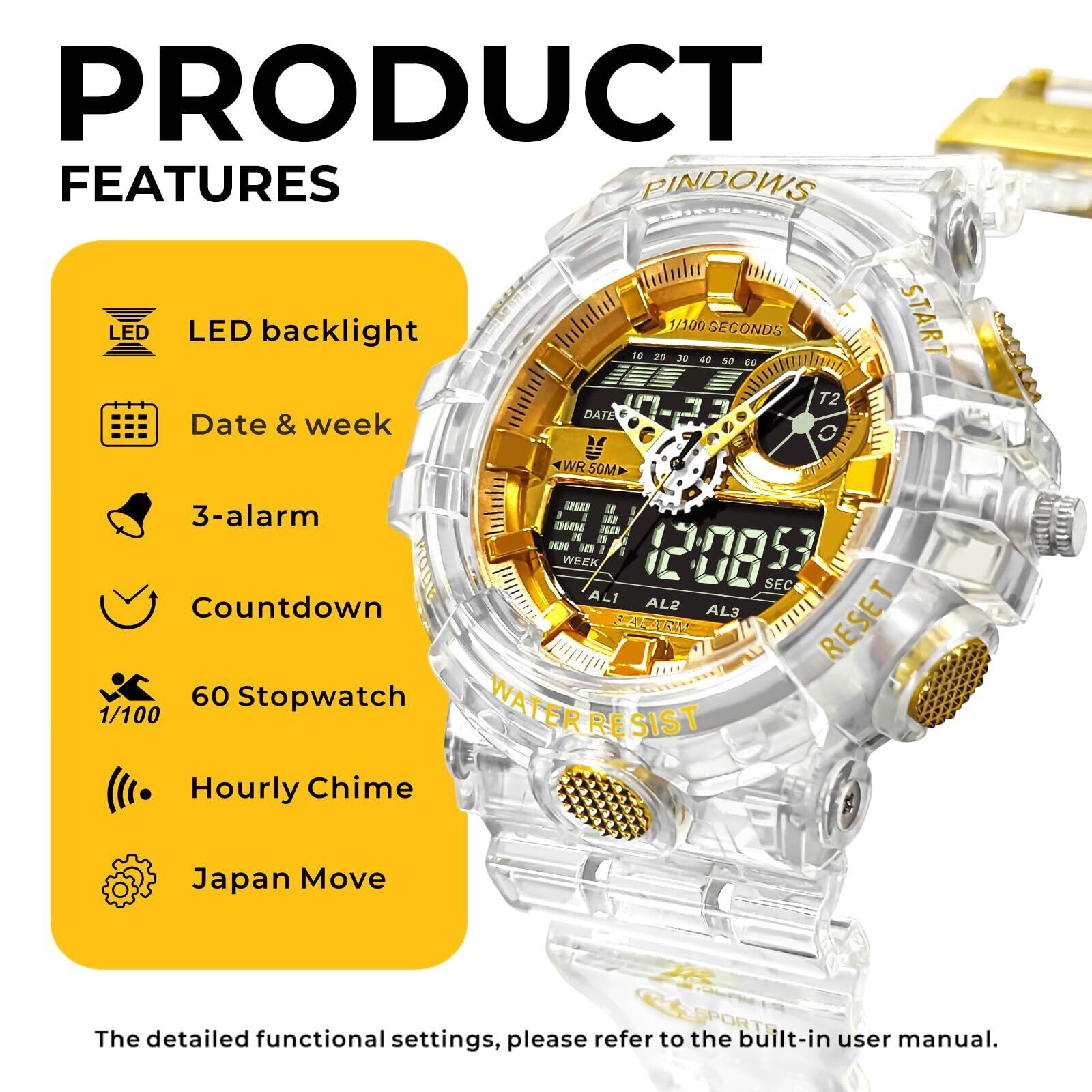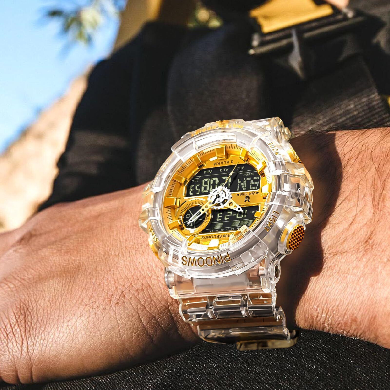 【ミリタリースポーツデザイン】PINDOWS(ピンドウズ)デジタルウォッチ メンズファッショナブルなスポーティな大きな文字盤デザイン、ミリタリースタイルの外観。デジタルとアナログの2つのタイムゾーンで、時刻を簡単に読み取り、デュアルタイムを設定できます。超明るいLEDライティング、雨や夜でもクリアな読み取りが可能です。頑丈で耐久性があり、ミネラルミラーサーフェスはより良いユーザーエクスペリエンスを提供します