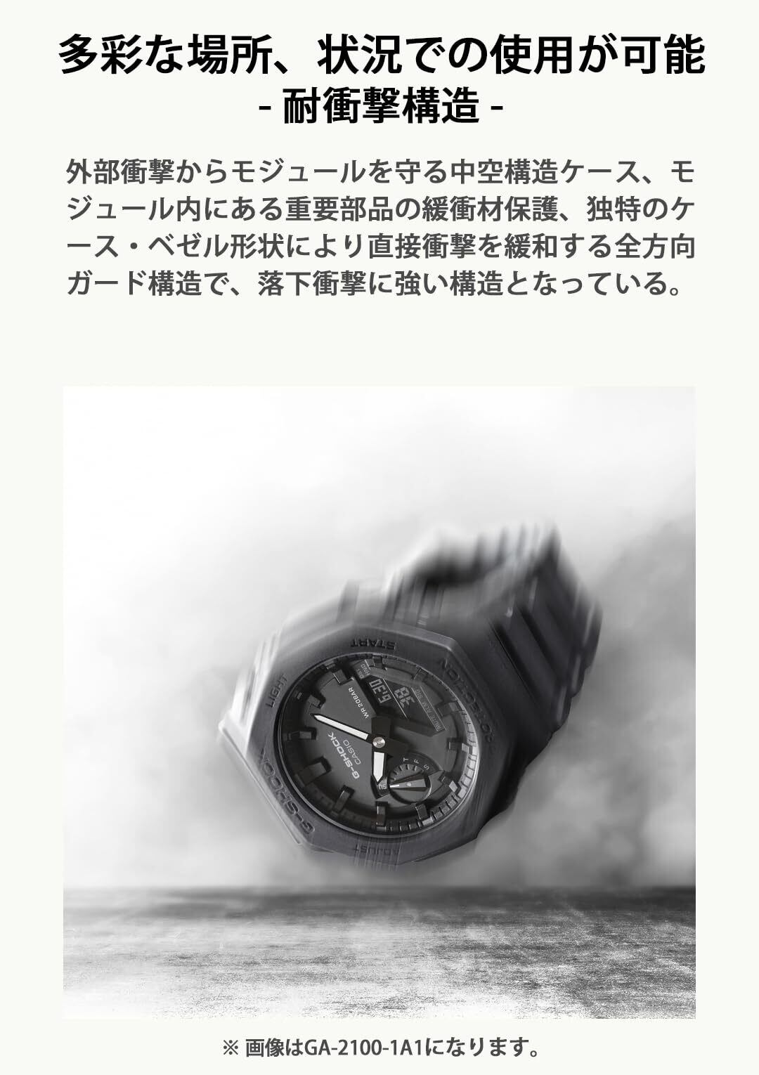 ワイドフェイスが好評のアナログとデジタルのコンビネーションモデル、GA-100からNewカラーが登場。マット仕上げのケースとバンドには、G-SHOCKのブランドカラーであるブラック×レッドとシンプルなホワイト×ブラックの2色を採用。文字板には4つの液晶窓とスピードインジケーターをシンメトリーにレイアウトし、すっきりとしたフェイスデザインに仕上げた。また、1/1000秒計測ストップウオッチや速度計測機能、JIS1種耐磁性能を搭載し、高い実用性も誇ります。ストリートファッションシーンで映えるタフなNewモデル。