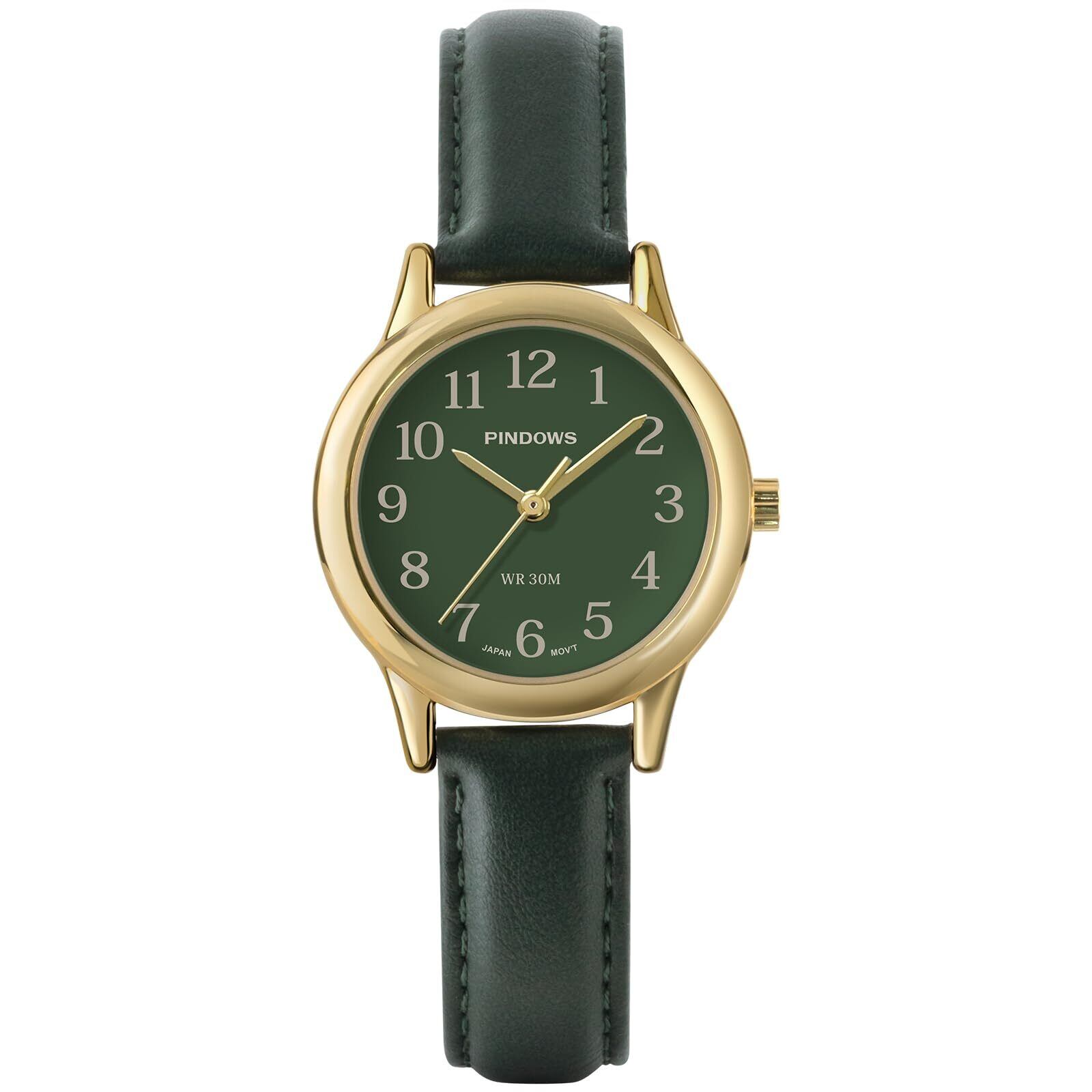 【在庫セール】PINDOWS女性用ミニマリスト腕時計、ゴールドトーンケースブラックレザーストラップ付き、おしゃれで毎日使えるエレガントなクォーツアナログドレスウォッチ
