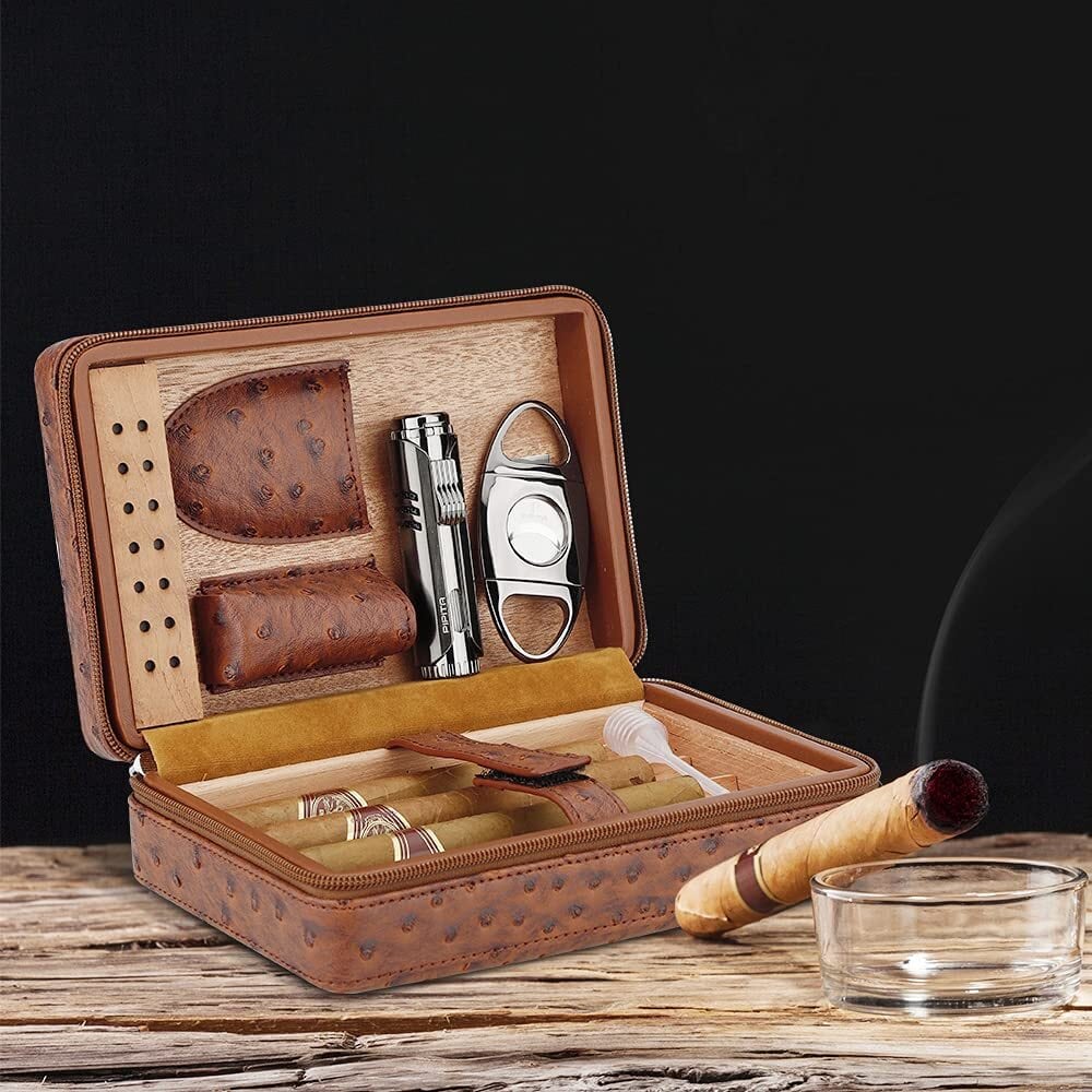 【シガーセットデザイン】:ポータブルトラベルレザーヒュミドールボックスとシガーライターとシガーカッター