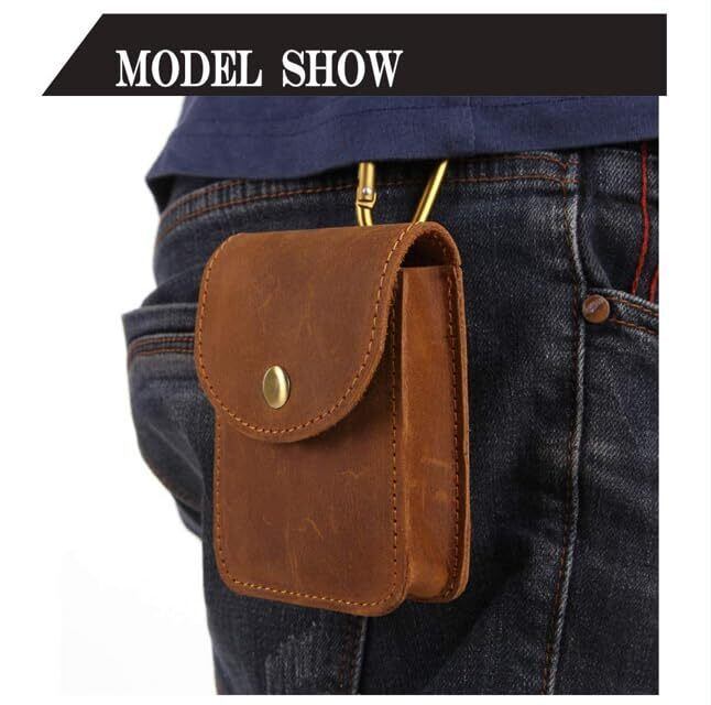 【新春セール】タバコケース タバコポーチ 厚手牛革 手作り メンズ 本革 ヌメ革 レトロ ウエストバッグ ベルト スマホ ウエストポーチ ベルトバッグ スマホケース 縦型 小物 カラビナ付き (D-ダークブラウン)