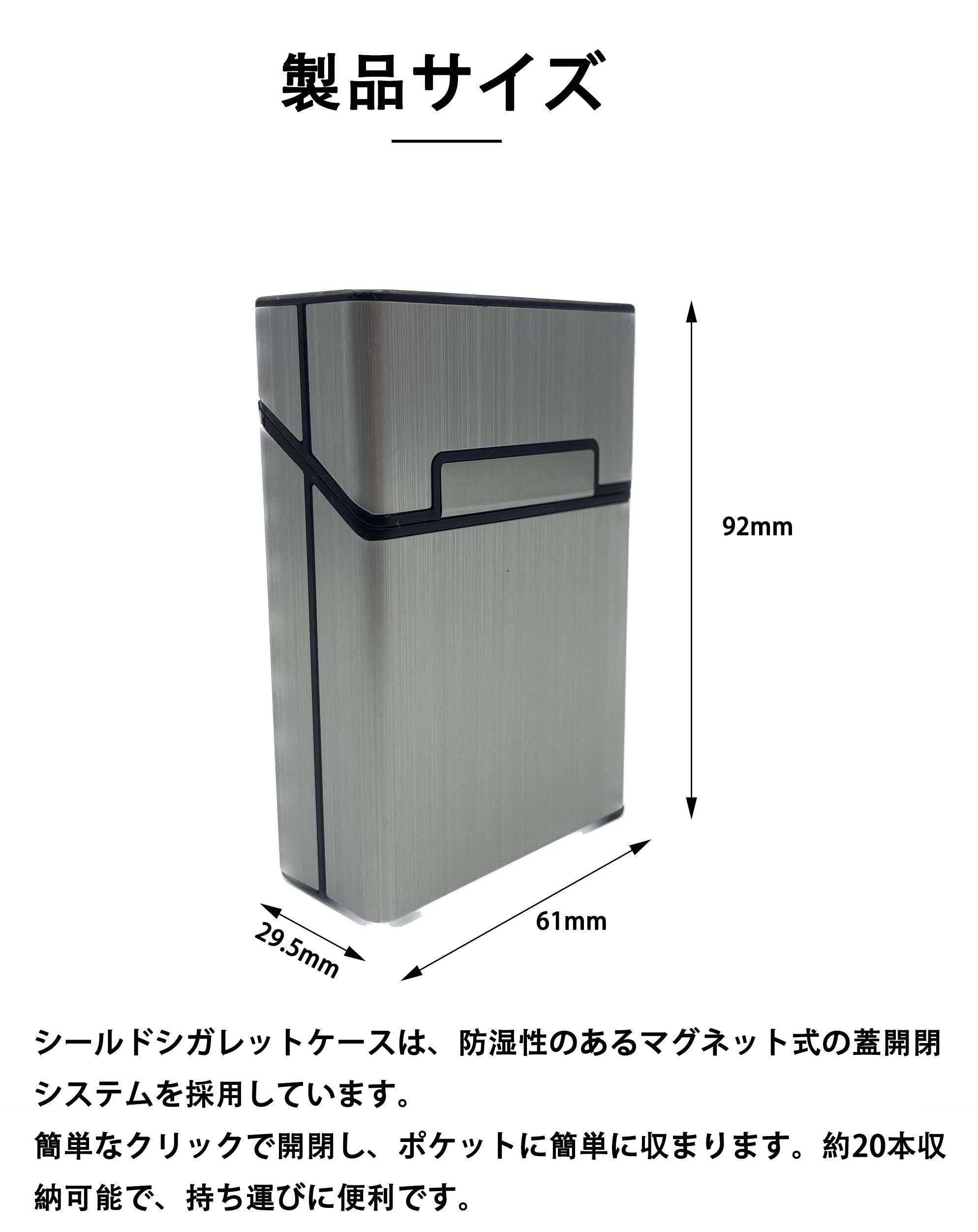 【材質】アルミニウム合金とプラスチック素材を使用した、軽量で耐久性の高いシガレットケース。サイズは61*92*295mmで、約20本のタバコを収納可能。スリムなデザインで持ち運びが簡単です。【マグネット蓋デザイン】マグネット蓋による開閉方式で、防水防湿設計の密封タバコボックス。常に新鮮なタバコを保ちます。【安定した取り扱い】頑丈でコンパクトなケースに、開閉ボタン付き。タバコを吸いたい時、ボタン一つでポケットに完全に収納できます。約20本のタバコを収納でき、持ち運びに便利です。【安全な収納】ハードシェルはタバコの飛び出しに対してより良い保護を提供します。仕事中にタバコをポケットに入れる心配がありません。【ギフト】シンプルでシックなデザインで、普段使いだけでなく、ご家族やご友人へのプレゼントにもおすすめです。レディースにも最適なシガレットケース レディース、タバコケース レディース。プラスチックBOXのタバコケース プラスチックBOX、手巻きタバコにも対応した手巻きタバコ ケースもご用意しています。