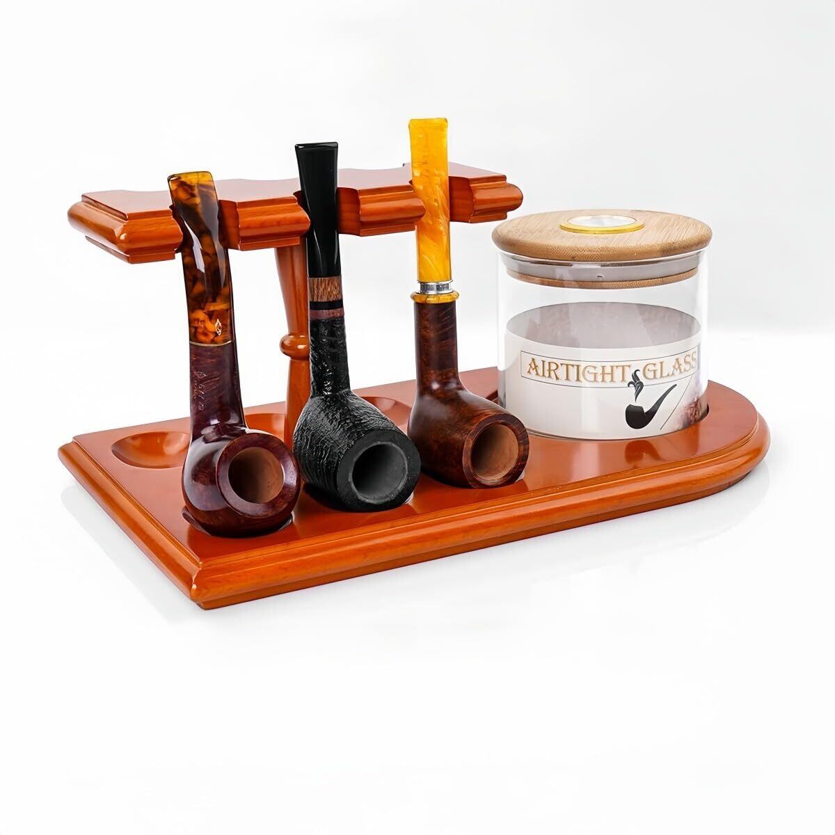 【人気商品】木製パイプスタンド 6本収納 ヒュミドールジャー付き 天然木香り パイプ展示スタンド タバコ小物収納 パイプ愛好家、父、兄弟、友人、ギフトに (パイプホルダー+保湿缶,黒)