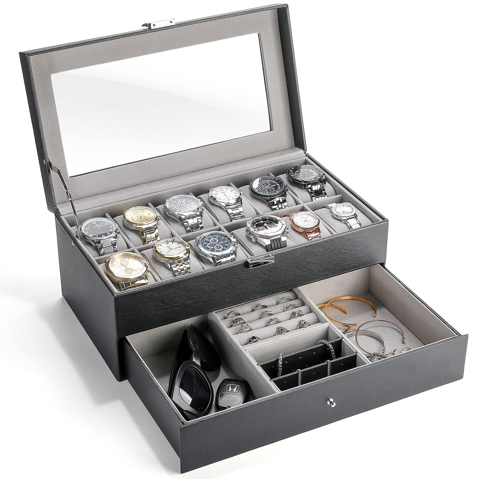 ProCase 腕時計ケース [12本用]、腕時計&ジュエリー 収納ボックス、ディスプレイケース 小物整理 取外し可能な土台 贈り物- ブラック