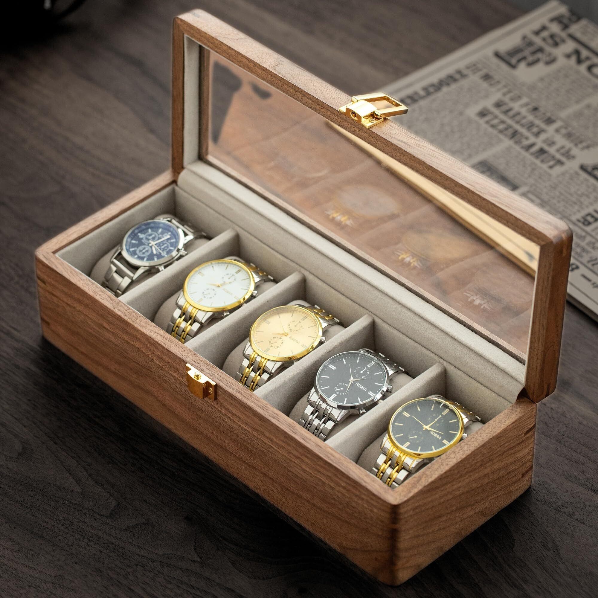 Muso Wood 時計ケース 5本用 木製 時計ケース 透明窓付き 収納ボックス 取り外し可能 枕付き 高級 時計ディスプレイ ウォッチケース(ウォールナット)