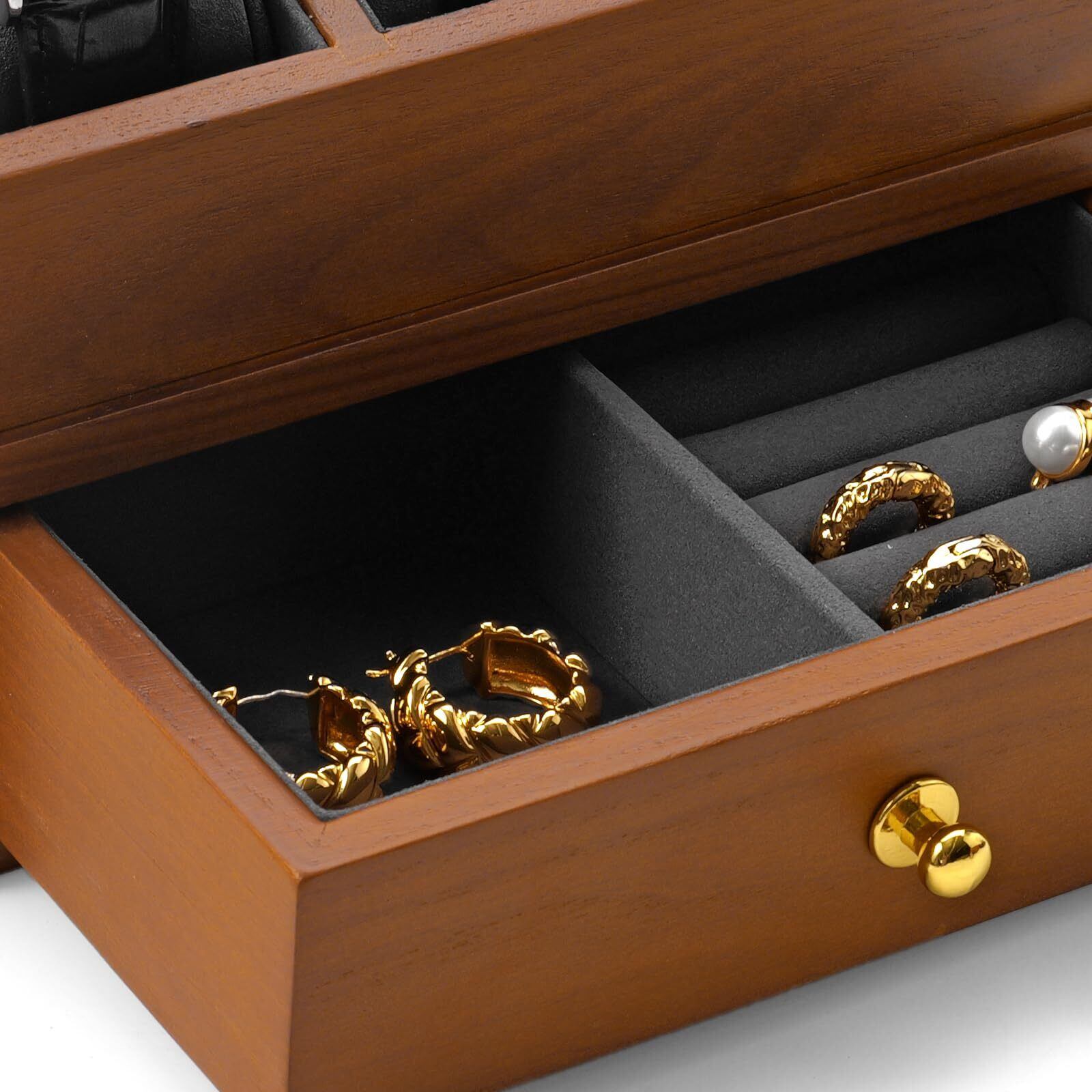【2段式木製時計ケース】上層部は3個のスロットが搭載されて、3本の腕時計を立てて収納可能です。下層の引き出しには2個のエリアがあり、ネックレス、指輪、ピアス、ブレスレット、ボタンホールピン、ブローチなどの追加スペースを提供します。