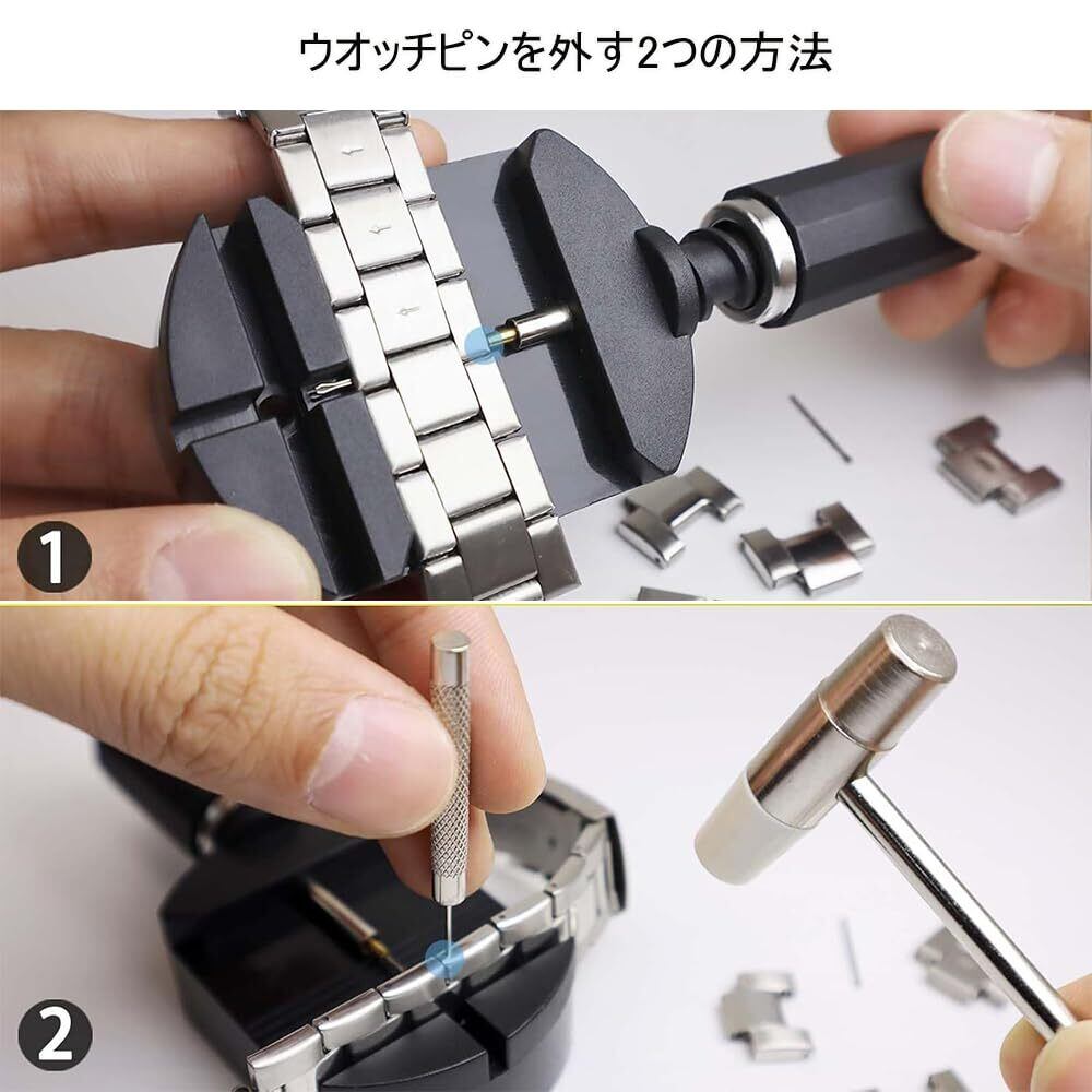 バネ外し工具やピン抜き工具、清掃用具がセットになっており、様々なタイプの腕時計に対応可能です。これにより、短時間でスムーズなベルト調整や修理が実現できます。