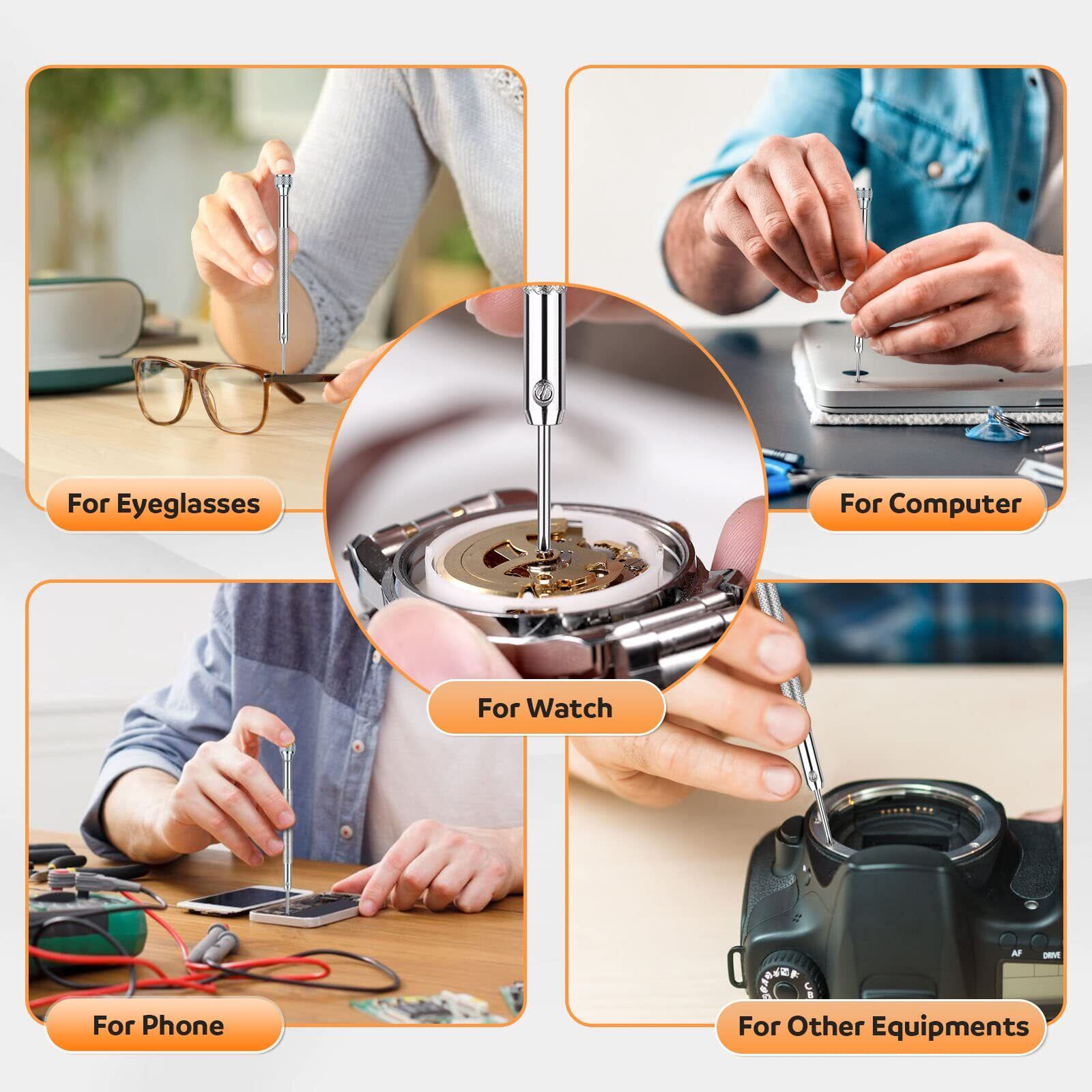 【幅広い用途】 時計修理、メガネ修理、時計電池交換、時計ストラップ交換、時計ブレスレットのスクリューリンク外し、ジュエリー加工、その他小型精密電子機器修理に適したセットです。