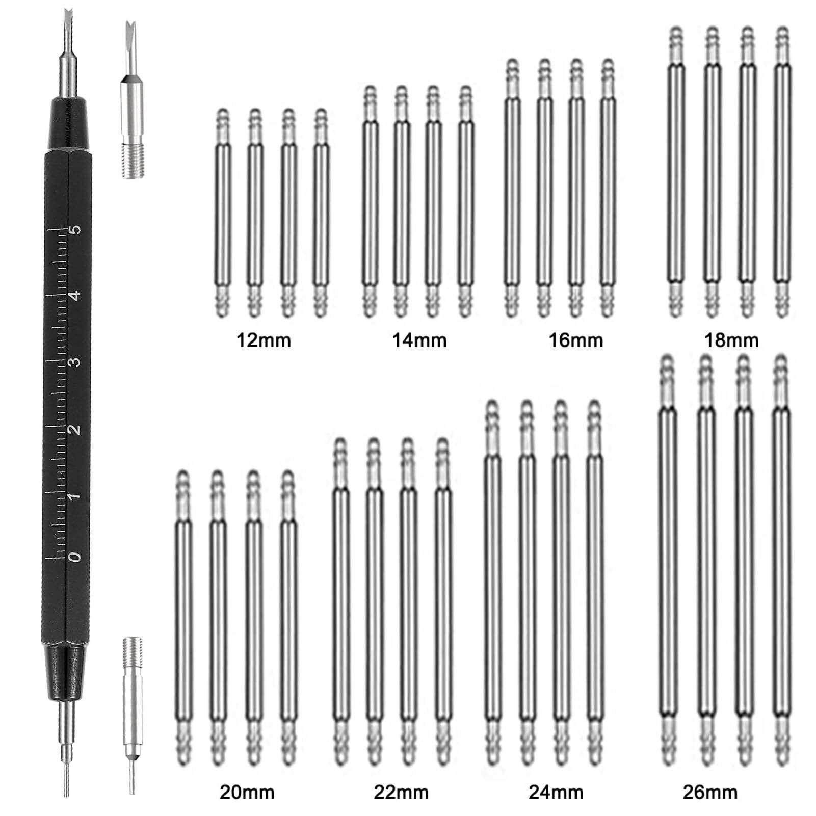 EDu 腕時計ベルト交換工具 バネ棒外し 替えの針2本付き 内蔵された定規 時計バンドピン ステンレス鋼 ベルトピン 32本(12-26mm)ブラック