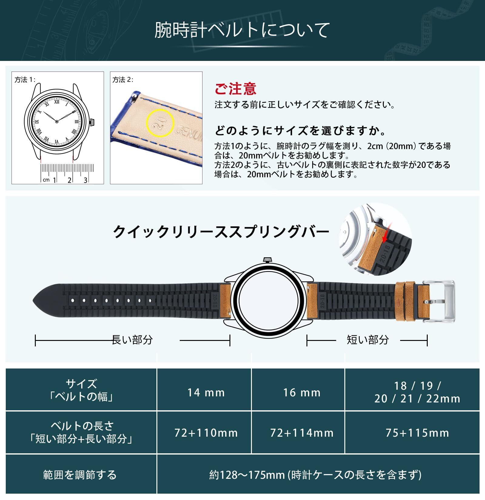 【クイックリリース時計ベルト】20mmのレザー時計バンドは、128-175mmの間の手首をフィットします(ケースの長さは含まれていません)。ステンレス鋼のバックルを装備して、適切なベルトの長さに簡単に調整するのに役立ちます。アップグレードクイックリリース、時計ベルトをすばやく変更できます。