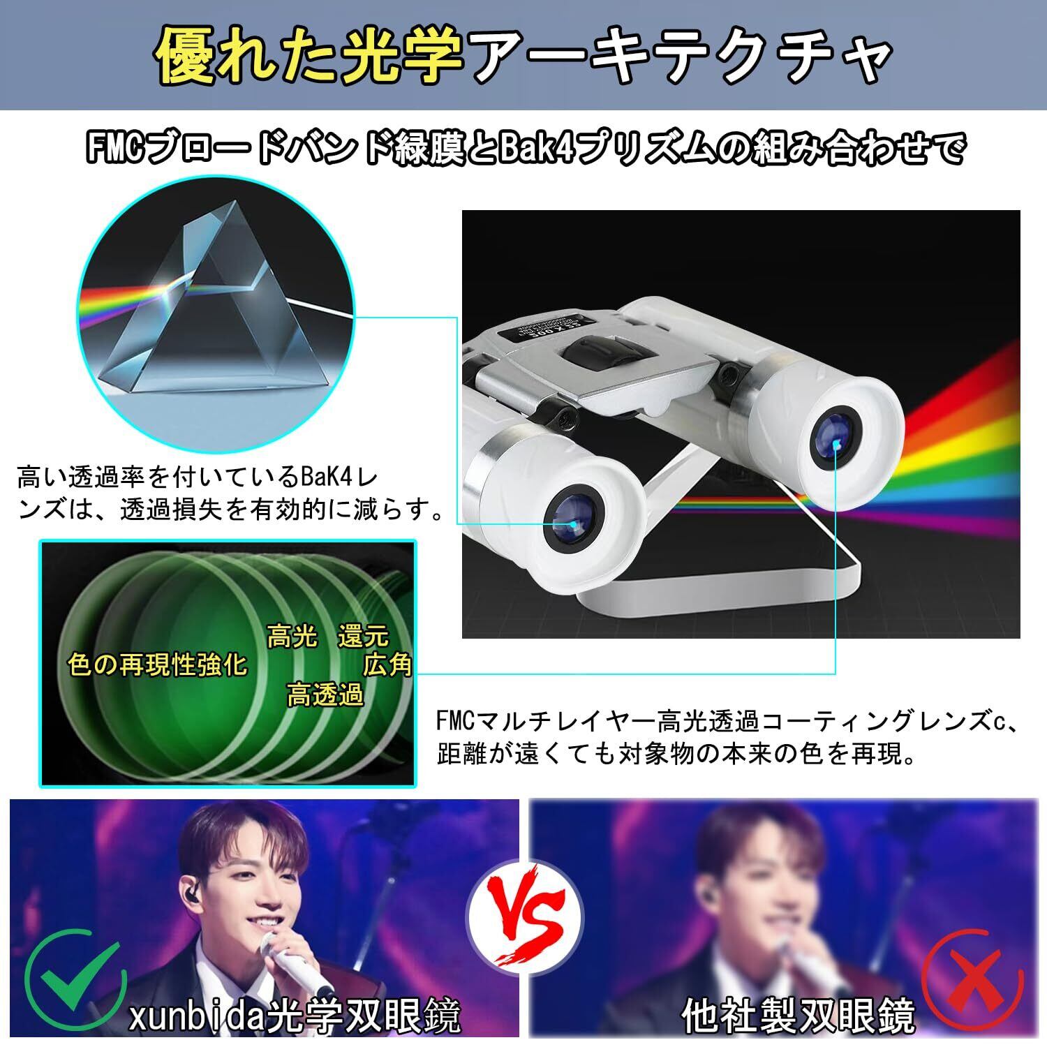オペラグラス ライブ用&優れた光学構造:双眼鏡のプリズム構造はポロプリズムタイプを採用し、FMCブロードバンド緑膜とBAK4プリズムの組み合わせで、高い集光力と明るい画像を実現しています。双眼鏡の対物レンズ直径は20mmで、光の損失を抑え、暗くなりがちな屋内会場でも、臨場感あふれる明るい視界を楽しむことができます。