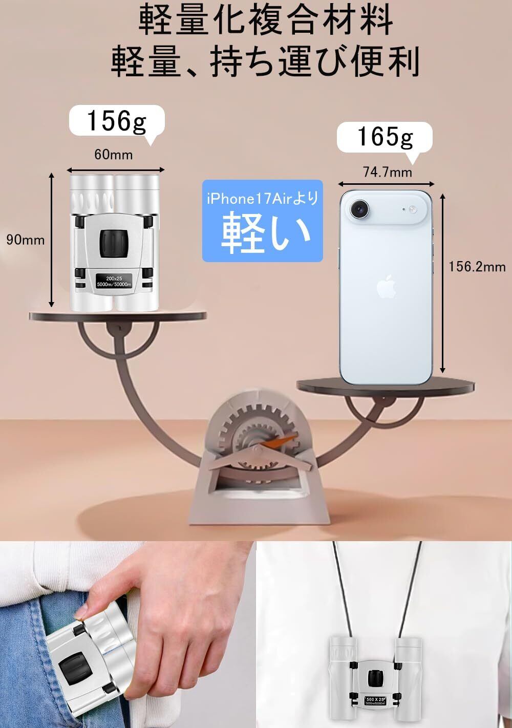 【コンパクトな構造は片手で操作できる】この小型望遠鏡はデザインが小さく、片手で持ちやすく、重さは158グラムで、手持ちはiPhone17air(165g)より軽くて、長時間使っても疲れません。 女性の手のひらにのるコンパクトサイズです。ポケットに入るくらい小さくて。超軽量·お子様や女性に最適。