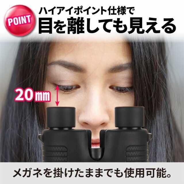 ・生活防止使用 急な雨にも対応。野外フェスや自然観察、キャンプ、野外スポーツ観戦 野球観戦 サッカー観戦 アウトドア バードウォッチ などにも最適です。 ・アイレリーフ(レンズから目までの適切な距離)20mmのハイアイポイント仕様 レンズと目の距離が離れていても綺麗に見え、メガネをかけたままで使用可能です。