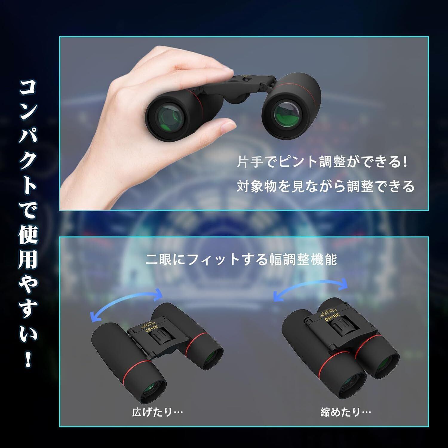 【小さい実力派!】軽量でコンパクト、本体重量がわずか178g、折り畳み式ので、片手で簡単に調整できます、長時間の使用でも疲れにくいです。収納袋、ストラップ付きなので、持ち運びにもすごく便利です。また、ポケットにも収納でき、見たいものがあったらすぐ使えます。防水設計ですので、雨や雪に強く、アウトドアでの使用でも安心して使うことができます。