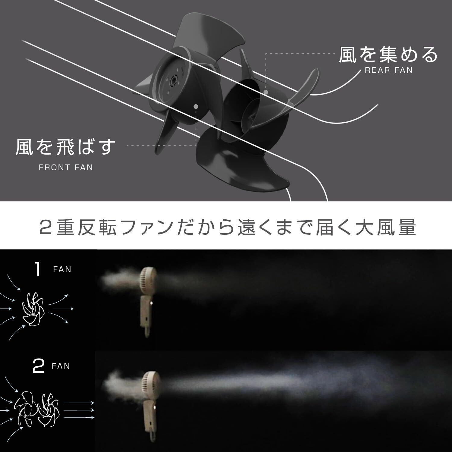 ファン構造:2枚羽根を向きを変えて前後に配置したリズム独自の「2重反転ファン構造」。後ろのファンで空気を集め、前のファンで筒状の風を届けます。2枚の羽根でコンパクトサイズなのに大風量を実現。どこでも使える3WAY:手持ち扇風機(ハンディ)、卓上扇風機、首掛け扇風機(ハンズフリー)として。さらに、イベントや旅行・お出掛けなど、持ち運びに便利なカラビナ付きです。