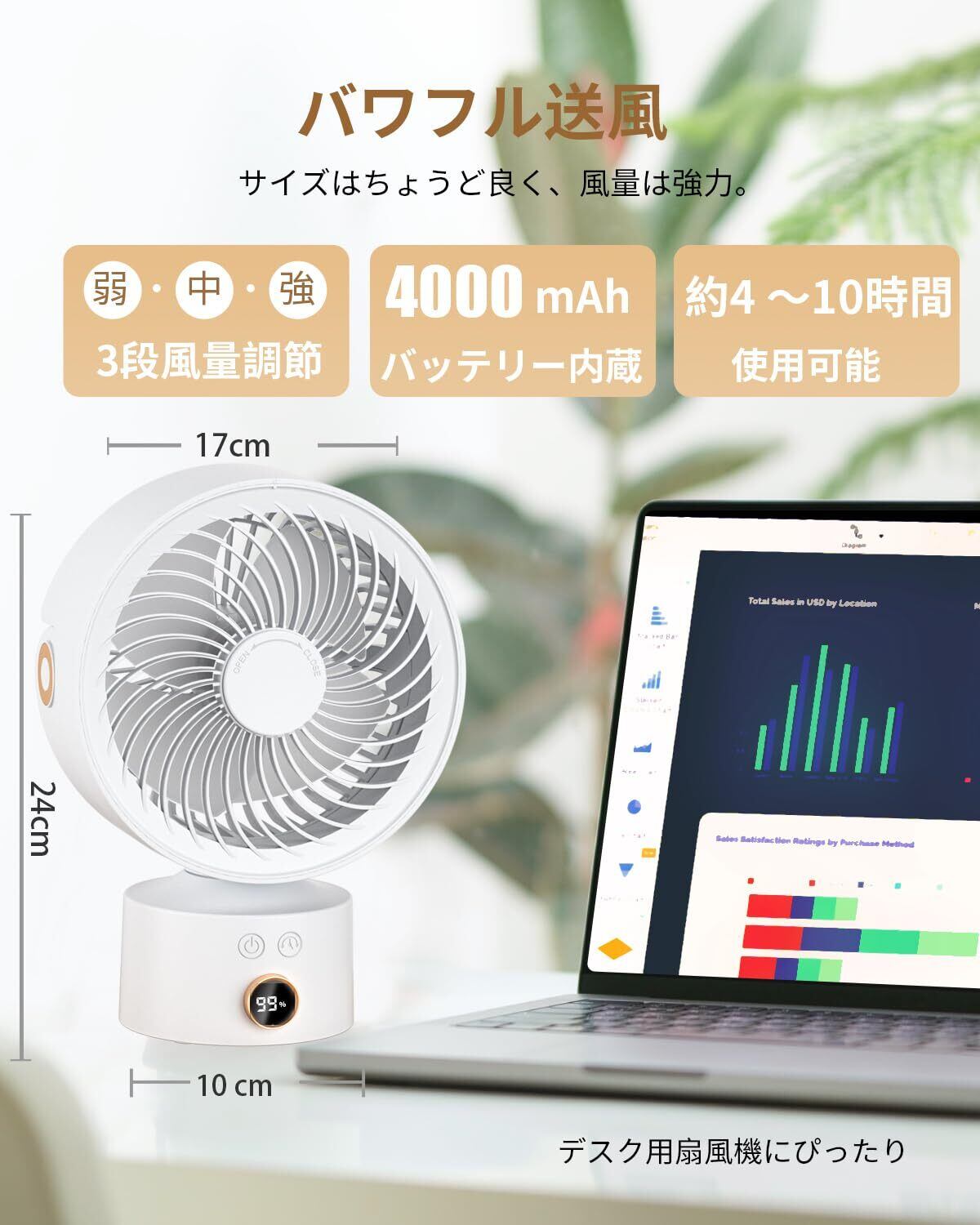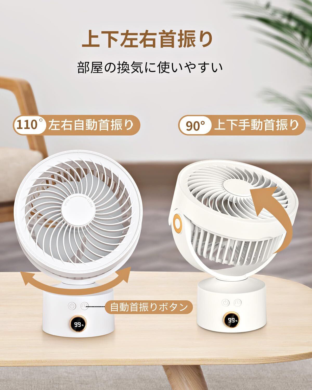 【在庫処分】サーキュレーター コードレス 静音 小型 自動首振り 充電式 オフィス 卓上扇風機 おしゃれ 北欧 軽量 LEDデジタル表示 DCモーター タイマー パワフル送風 3段階風量調節 洗える 分解丸洗い 空気循環 部屋干し 冷房/暖房 梅雨除湿 衣類乾燥 屋外 扇風機 トイレ に 換気扇 が ない 対策 (ホワイト)