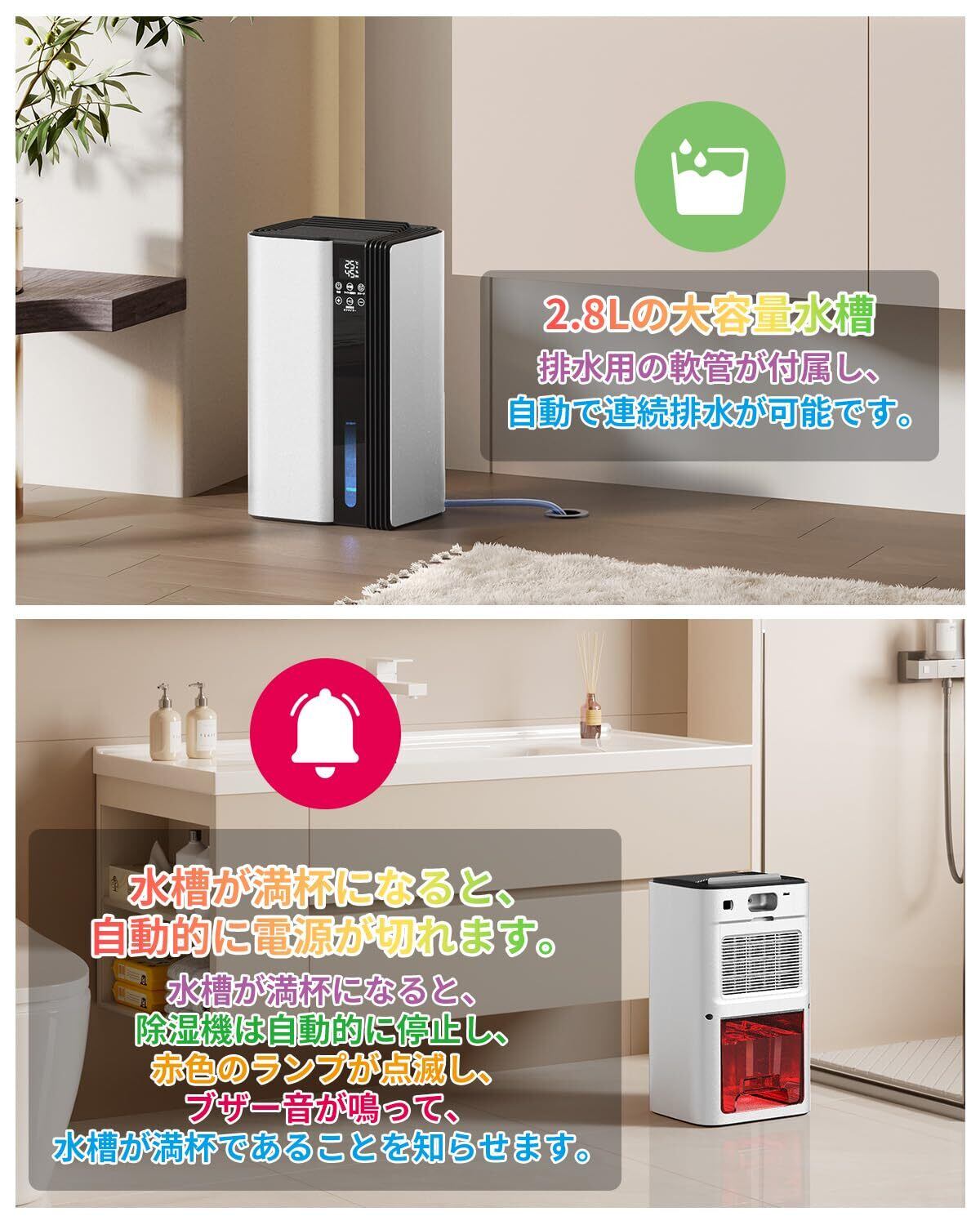 満水になると自動で運転を停止し、安全性を確保しています。さらに、静音運転のため、寝室やリビングでも気にせず使用でき、快適にお休みいただけます。日常生活にストレスを感じることはありません。