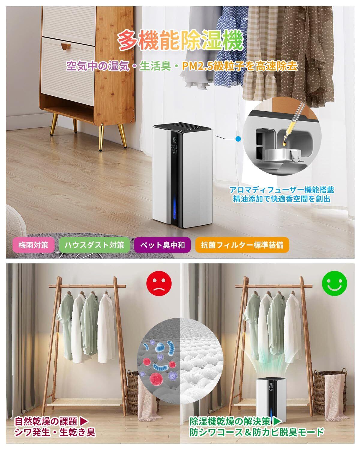 【ペルチェ式・1L/日抜群な除湿量・強力小型除湿器】アップグレードのペルチェ式半導体小型除湿機です 空気中の湿気を素早く吸収し、湿気の多い部屋をドライで快適に!室温30℃、相対湿度80%の周囲条件下では、最大除湿能力は約1200mL/日に達します。小型化と省エネに加え、従来のペルチェ式除湿機にはなかった衣類乾燥機能を追加し、洗濯物をより早く乾かすことができます。梅雨時期に洗濯物から生乾きの臭いがしやすいため。 マイナスイオン発生器は、空気中に放出したマイナスイオンによって臭いを低減することができます。衣類のイヤな臭いを抑制しながら、衣類をより早く乾かします。