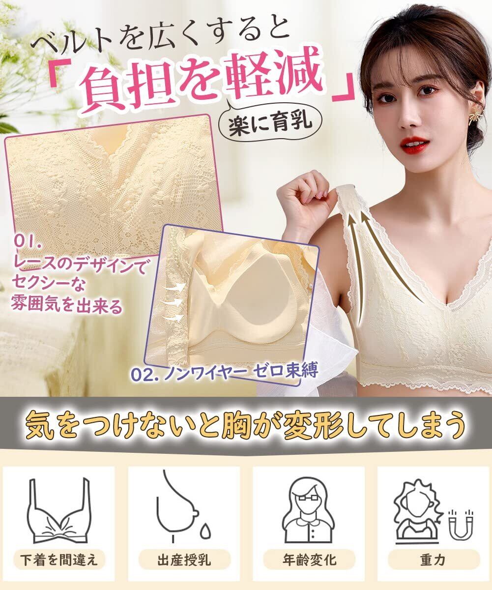 柔らかなレース素材と通気性の良い生地を使用しており、ムレを防ぎながら快適な着心地を提供します。暖かくなりがちな寝室でも、さらっとした肌触りが保たれ、快適な睡眠をサポート。健康的なバストケアを実現します。